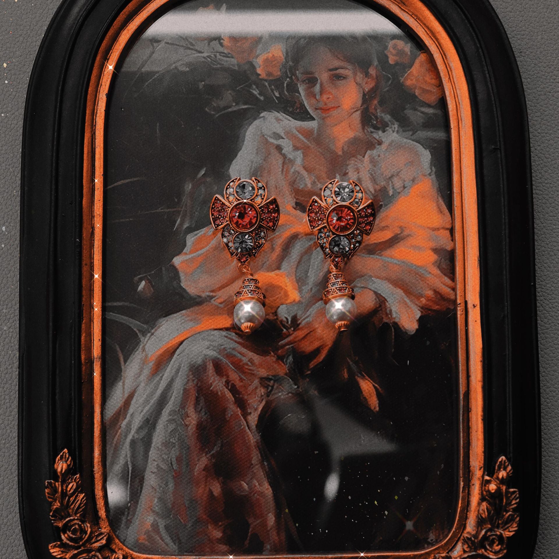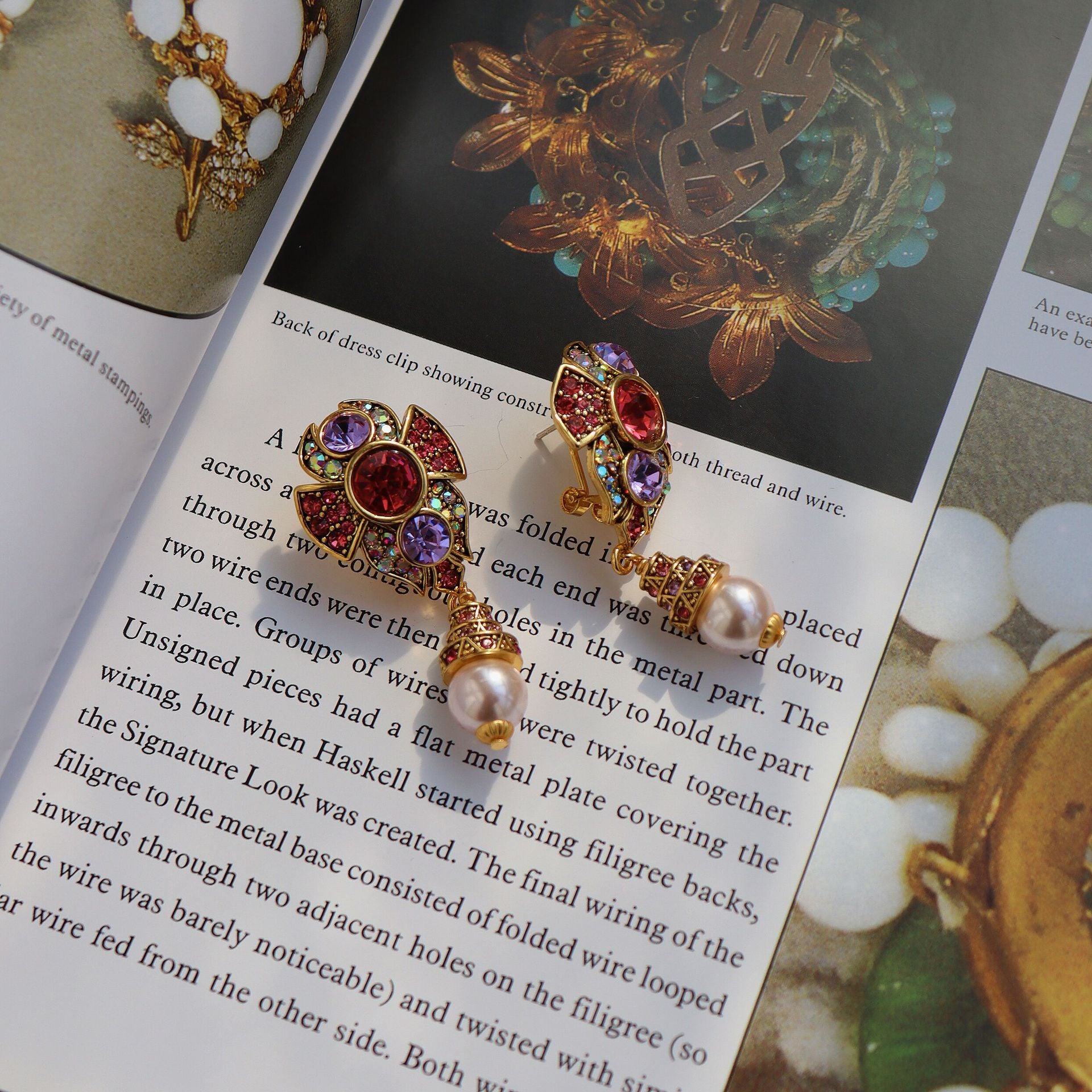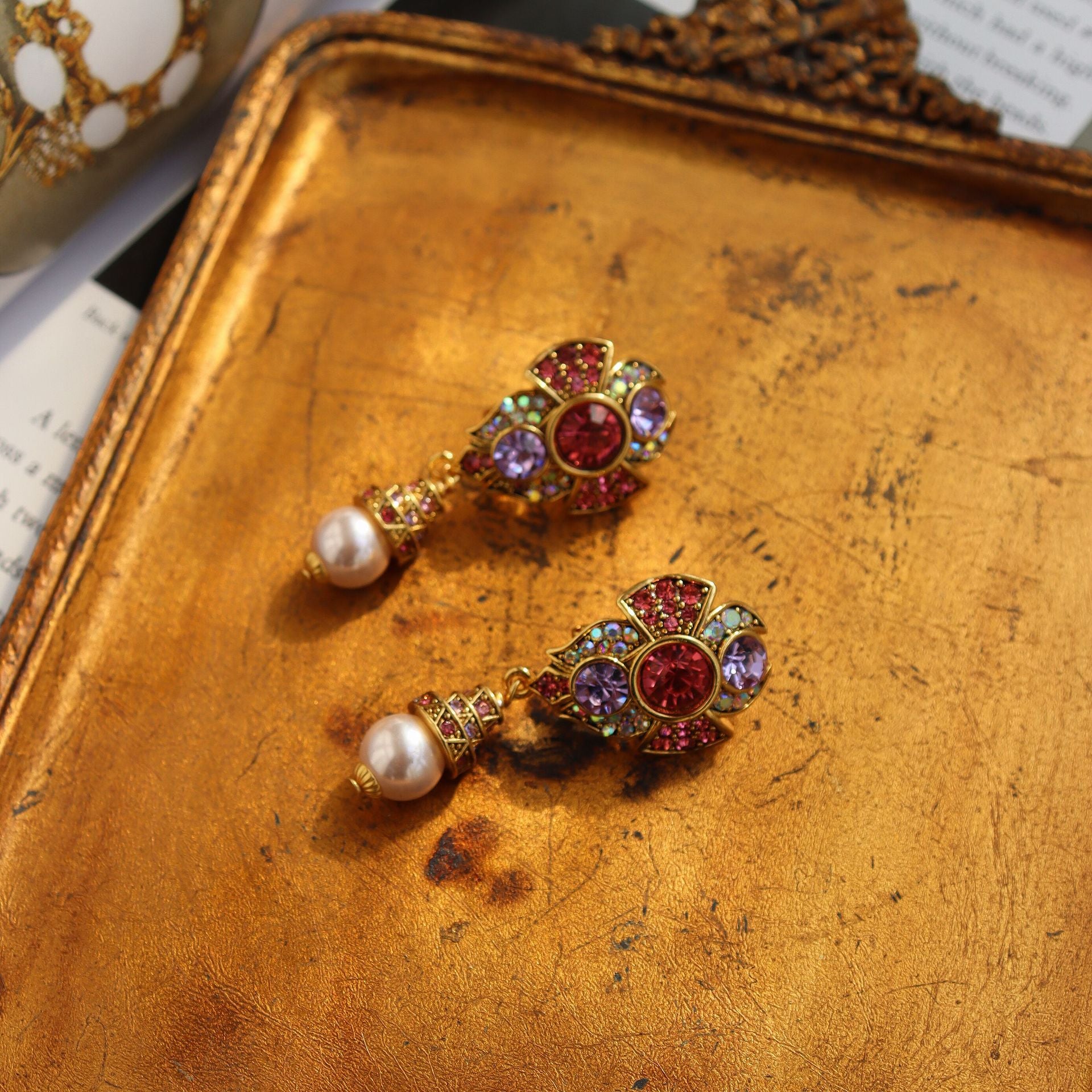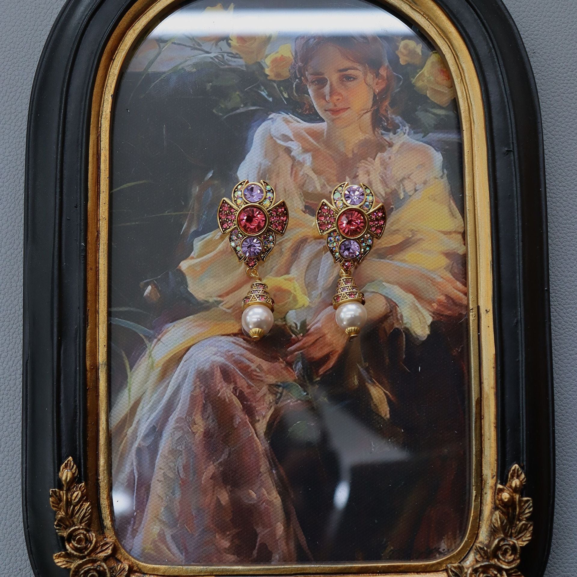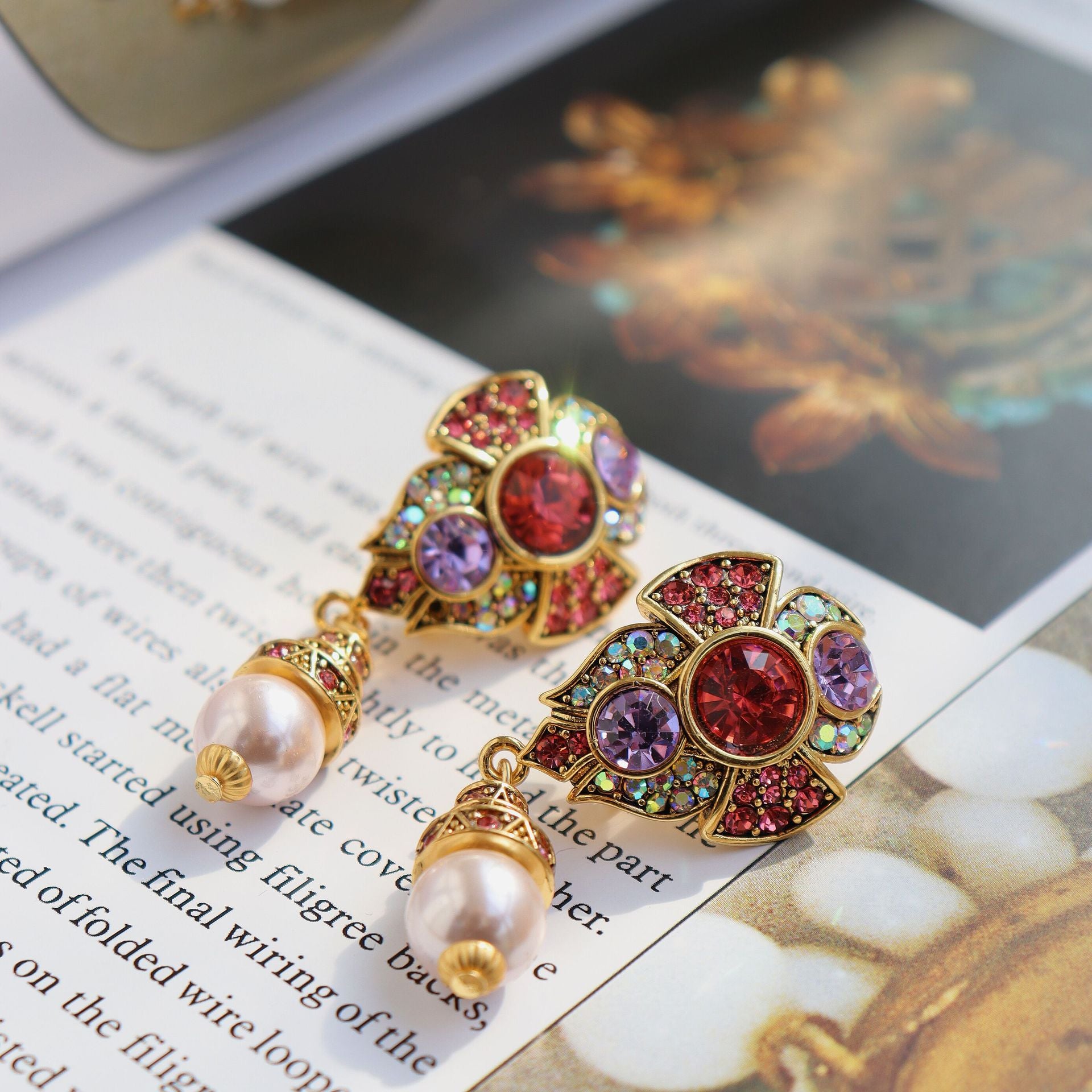 هذه الأقراط العتيقة الطراز احتفاء ببهاء الألوان الباروكية وتفاصيلها. مرصعة بكريستالات بافيه بألوان القرمز والأرجواني وتدرجات قوس قزح، تتفتح بتصميمها من مركز ملكي وتنسدل في النهاية بقطرة لؤلؤ صناعي أنيقة. متقنة وفيها لمسة من اللعب—مثالية لدخول شاعري ولافت.