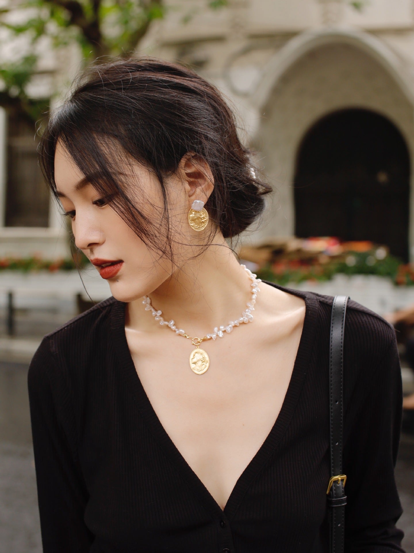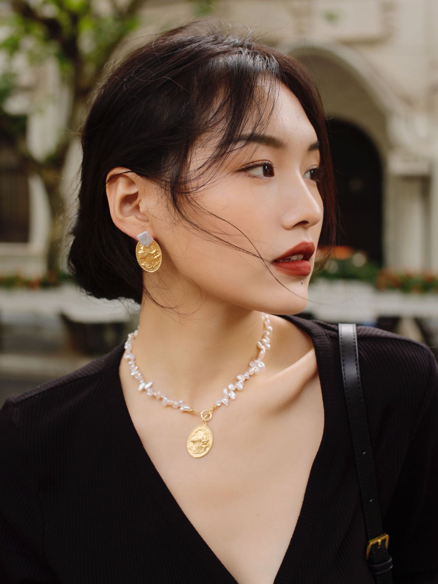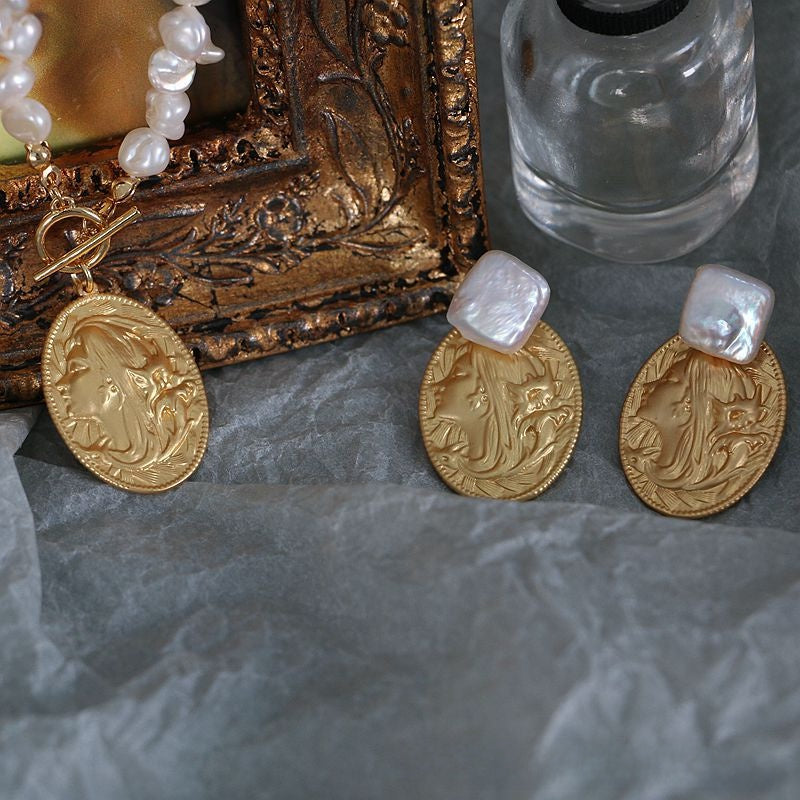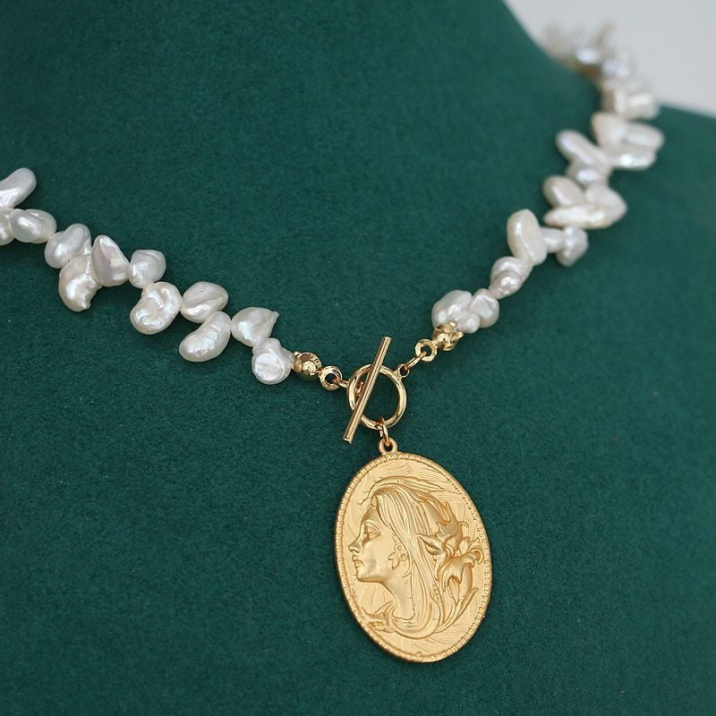 هذه القلادة المستوحاة من الطراز الكلاسيكي تجمع لآلئ باروكية طبيعية غير منتظمة، صاغها الماء والزمن، وتزينها حلقة إغلاق نحتية بلون الذهب العتيق، يتدلى منها ميدالية بيضاوية كبيرة تصور إلهة هادئة. تعكس الملامح بروفيلات النقوش النهضوية والرموز المقدسة—تجسد للمرأة العصرية قوة كلاسيكية أصيلة.
