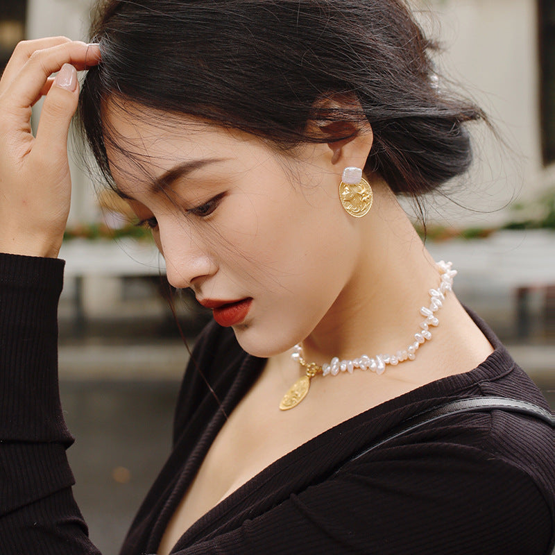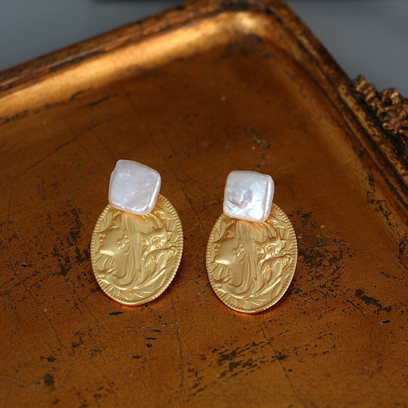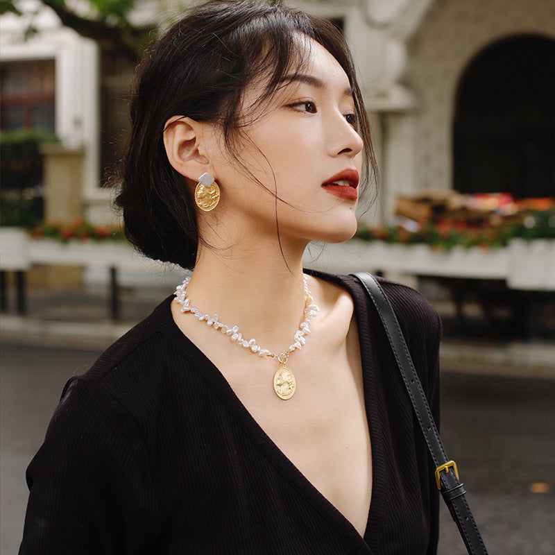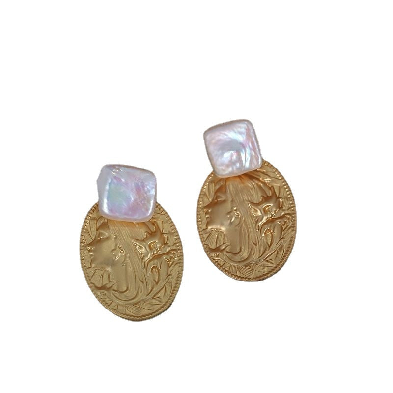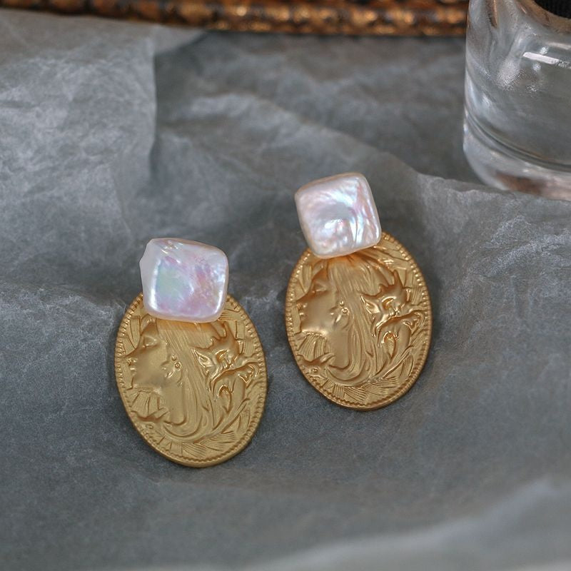 هذه القلادة المستوحاة من الطراز الكلاسيكي تجمع لآلئ باروكية طبيعية غير منتظمة، صاغها الماء والزمن، وتزينها حلقة إغلاق نحتية بلون الذهب العتيق، يتدلى منها ميدالية بيضاوية كبيرة تصور إلهة هادئة. تعكس الملامح بروفيلات النقوش النهضوية والرموز المقدسة—تجسد للمرأة العصرية قوة كلاسيكية أصيلة.