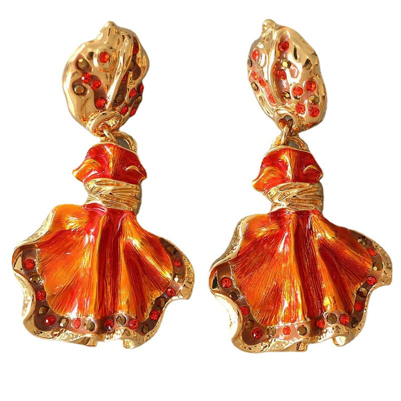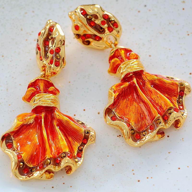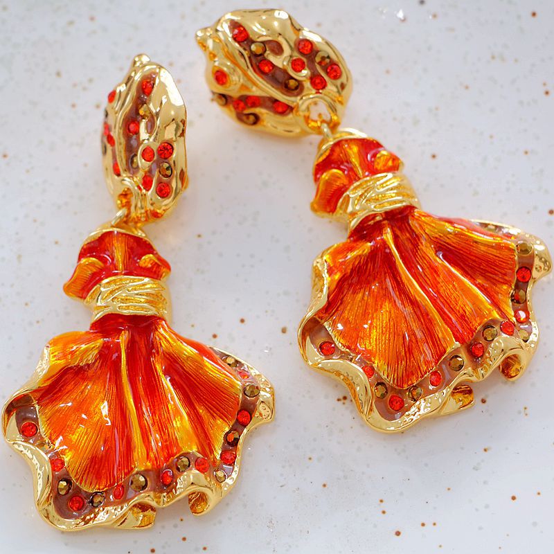 مستوحاة من مجوهرات القصور الأوروبية من عصور مضت، تأتي هذه الأقراط الفنية على هيئة سمكة ذهبية راقصة—مفعمة بالحركة والفخامة وسحر الطراز القديم. صُنعت يدوياً من النحاس الأصفر الثقيل ومطلية بالذهب الخالص، وتتلألأ بمينا يدوي أحمر-برتقالي وأحجار الراين البراقة، لتمنحك جاذبية باروكية درامية.