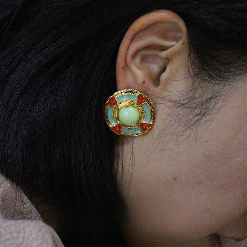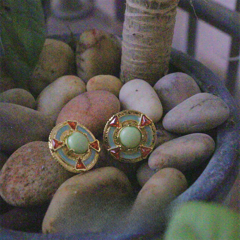 تعكس هذه الأقراط اللافتة المستوحاة من الطراز العتيق شكل البوصلة في العصور الوسطى—جريئة وزخرفية. صُنعت يدويًا من المينا الأزرق الفاتح، وزركونيا مثلثة متألقة بلون ناري، وقبة مركزية من الراتنج بلون النعناع الفاتح، ليمنح التصميم وهجًا رومانسيًا مستوحى من روح الاكتشاف وحرفية العصور الوسطى. تنتهي بطلاء ذهبي لامع فوق النحاس الأصفر، وتثبت على الأذن بدبابيس من الفضة عيار S925 المناسبة للبشرة الحساسة.