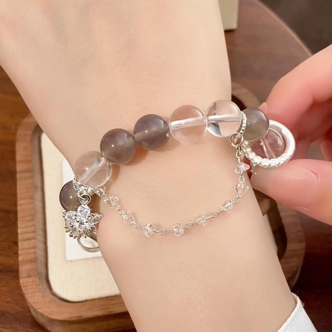 Elegant and ethereal, Mist Bloom is a delicately crafted bracelet combining natural smoky grey agate, ice-clear white quartz, and freshwater pearls. Accented with floral alloy charms and a fine crystal chain, this bracelet glows with quiet sophistication and dreamlike calm.