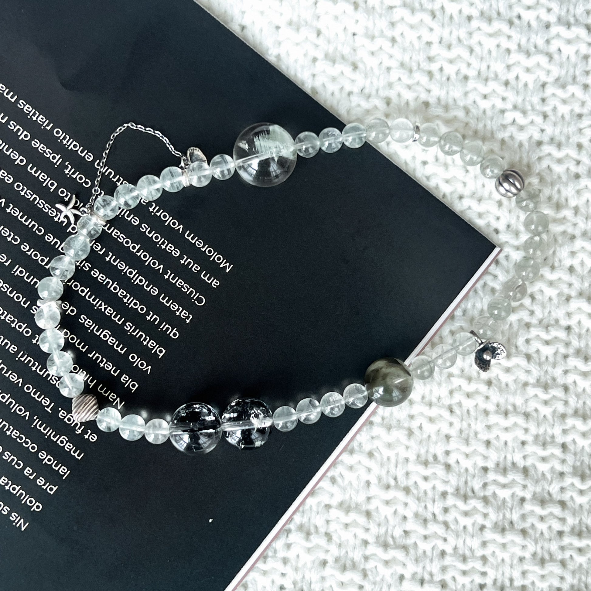 ✨ Sterling Silver Accents (Thai silver beads and charms) — Matte silver textures add depth and contrast, like threads of moonlight binding together mist and night. They enhance the design with both artisanal elegance and a sense of timeless grounding.