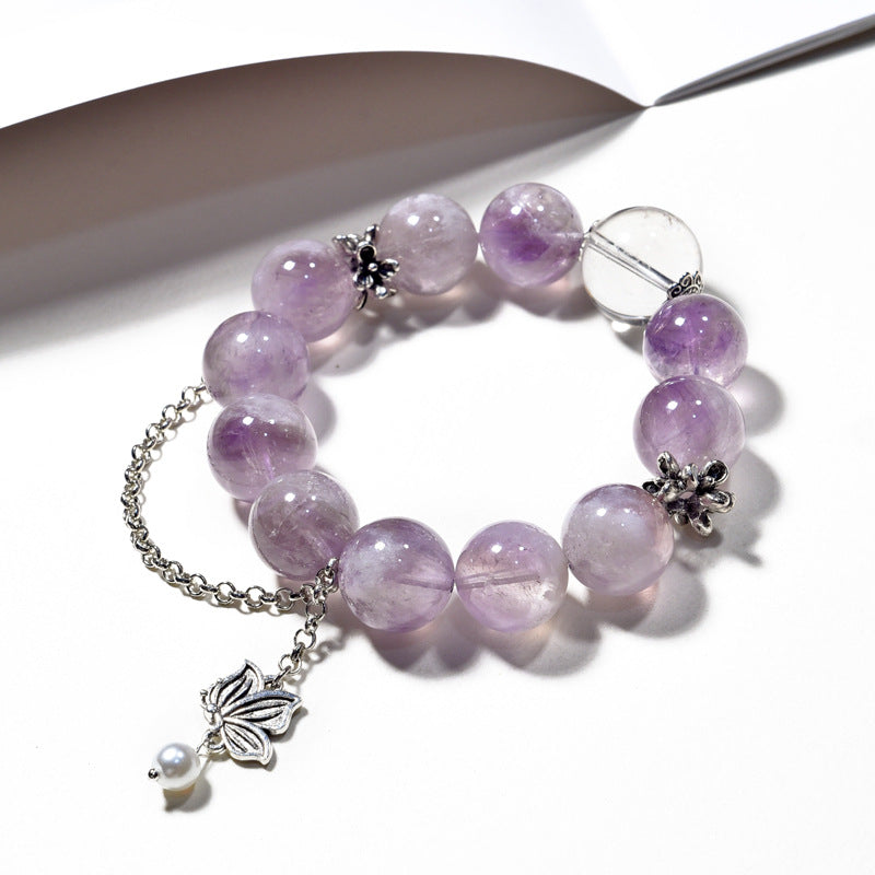 An ethereal bracelet crafted from 15mm natural Lavender Rutile Quartz, known for its soft lilac glow and shimmering needle-like inclusions. Each bead glistens with a silken inner light, echoing the grace of moonlight on petals.
