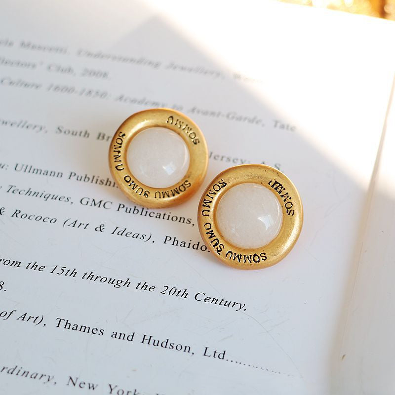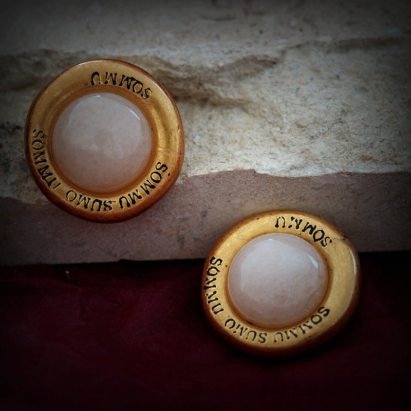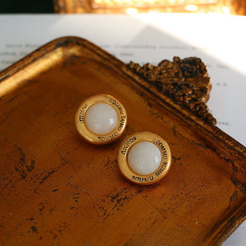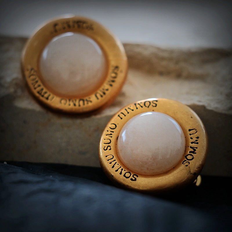 هذه الأقراط الكليب النادرة والفينتج تتميز بكريستالات بيضاء طبيعية مقطوعة بشكل دائري، محاطة بالنحاس المطلي بالذهب المعتق. النقش المحيط بالحافة والمشابه للكتابات اللاتينية يضفي هالة غامضة وسحرية – كأنها تعويذات من عرافة منسية.