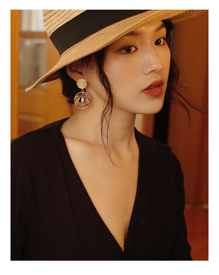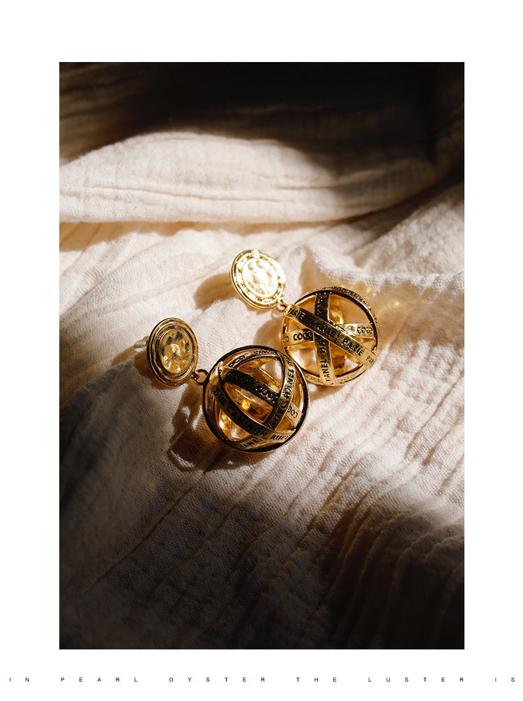 تتميز هذه الأقراط الجريئة والثقيلة بكريات نحاسية مجوفة تتقاطع معها شرائط مطلية بالذهب وبتفاصيل بارزة—كأنها حلقات كواكب تدور في مدارها. صُنعت بروح عتيقة وحضور معماري، لتجسد عظمة التصميم المستقبلي بنفحة رجعية.