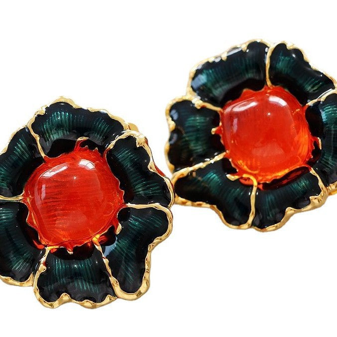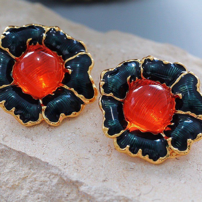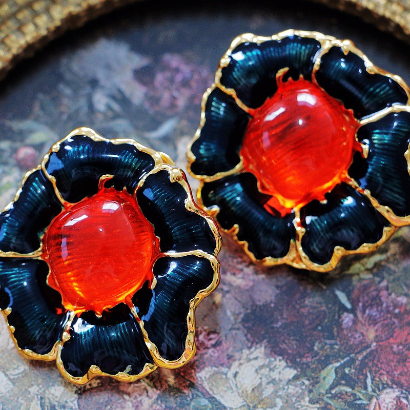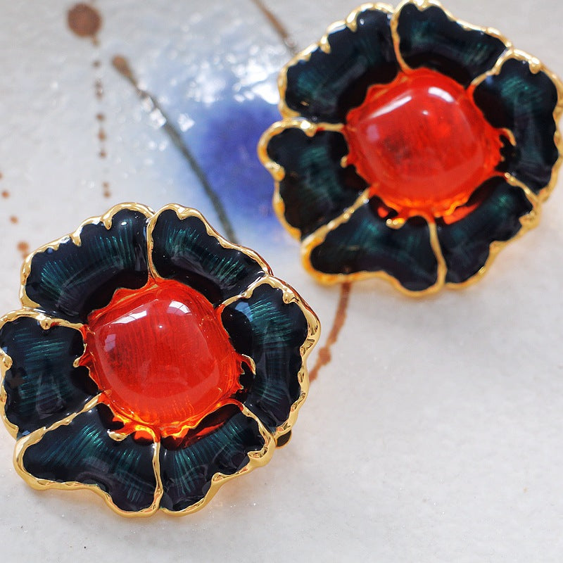 تتألق هذه الأقراط الزهرية ذات الطابع الكلاسيكي ببتلات مطلية بالمينا السوداء الجريئة تحيط بمركز زجاجي شفاف بلون الأحمر البرتقالي المتقد. بتصميمها المنحوت والعفوي، تستحضر سحر الفن العتيق—وكأنها زهرة خشخاش مصبوبة من نار وظلال. متوفرة بنظام كبسة للأذن أو بمسمار لتناسب جميع الأذواق.