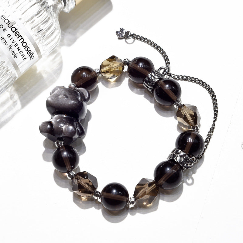 A playful charm meets deep grounding energy. This unique bracelet features a hand-carved silver obsidian bear centerpiece, surrounded by large smoky quartz and silver obsidian beads for a bold, stabilizing look.