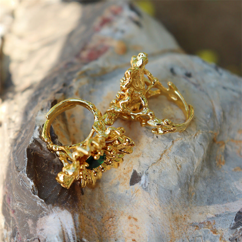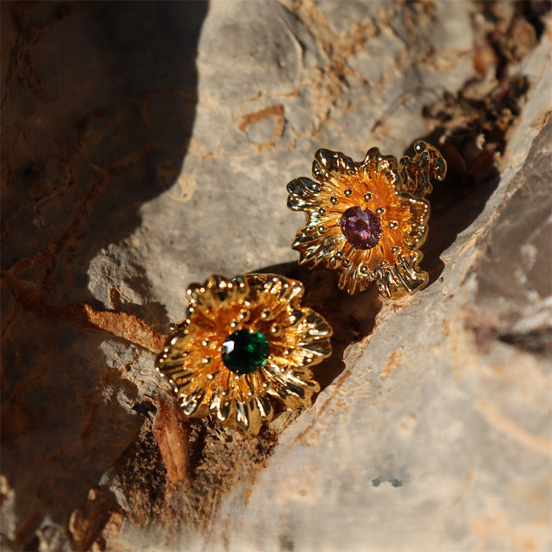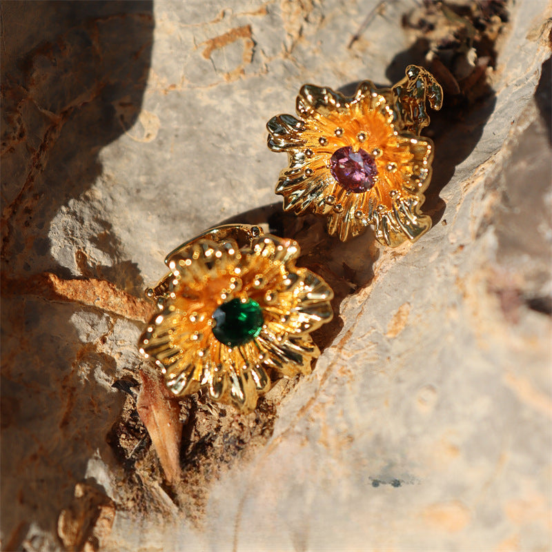تتألق هذه الخاتم الجريء المستوحى من الطراز العتيق بزهرة ذهبية مصقولة تبدو وكأنها مصوغة باليد، تنبض بالنقوش والتفاصيل المجسمة. وفي مركزها تتربع كريستالة متوهجة بلون الزمرد الأخضر أو الأرجوان الملكي، تثبت الشكل كقلب الشمس المتلألئ. مع بتلاتها المتموجة وتفاصيلها المنحوتة، تشع القطعة بروح ملكية وأصالة طبيعية.