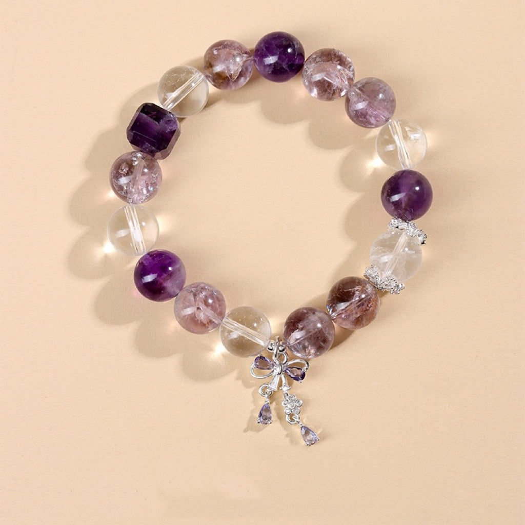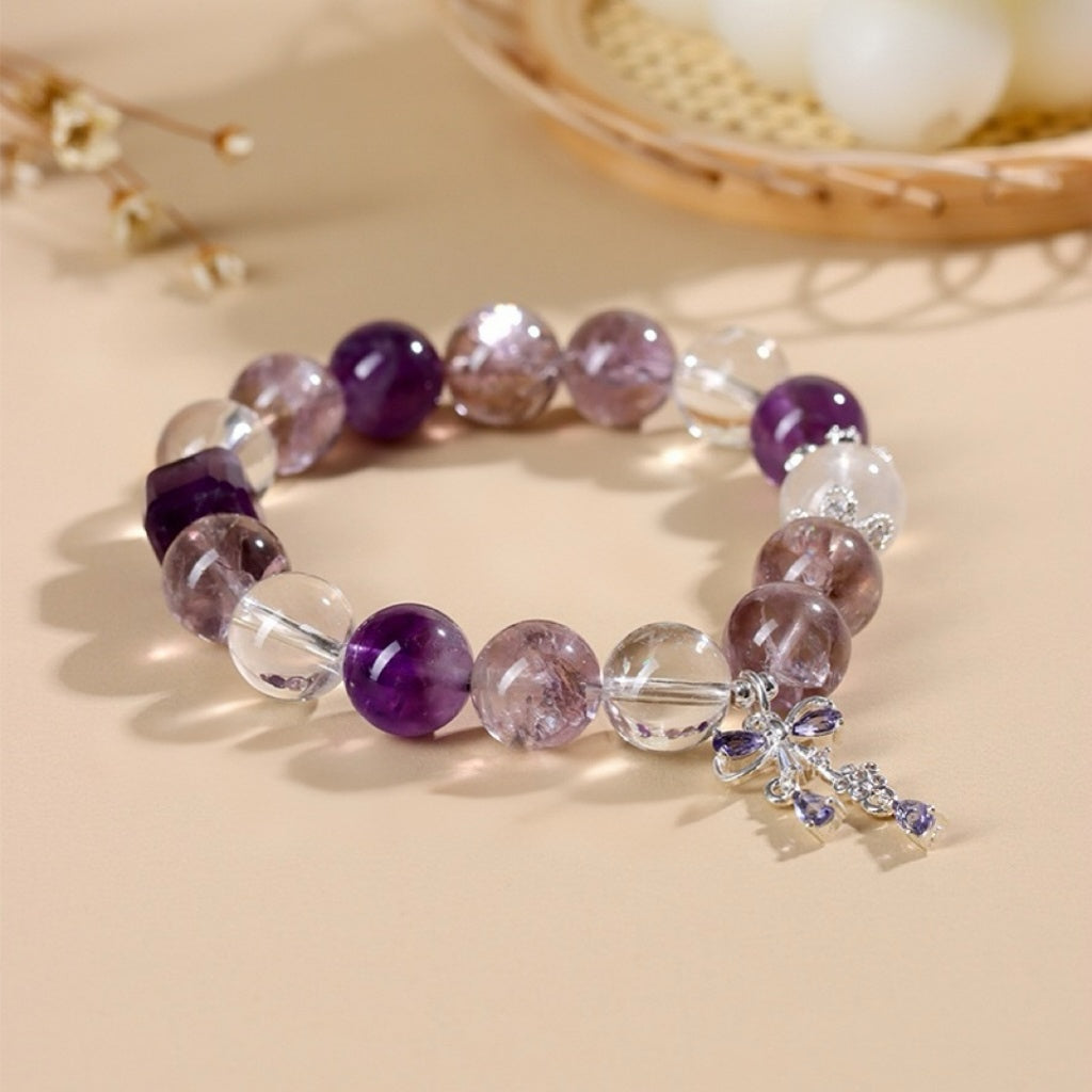 سوار مشرق مصنوع يدويًا يضم أميثيست طبيعي، كوارتز بنفسجي متشعب، وكريستال شفاف، تتوسطهتعليقة فراشة رقيقة — رمز التحول والتجدد الروحي. بدرجاته البنفسجية الناعمة وملمسه المتلألئ، يستحضر هدوء الغسق وتفتح الحكمة الداخلية بهدوء.