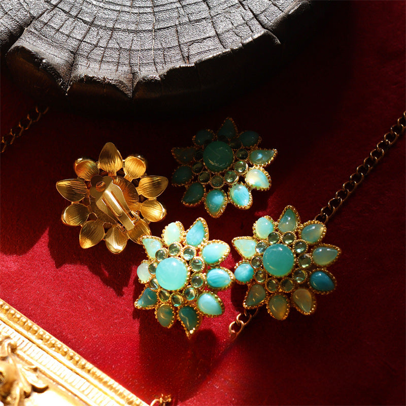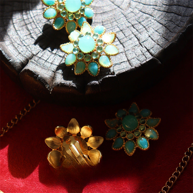 تتألق هذه الأقراط المستوحاة من الطراز العتيق ببتلات من الريزين اللامع بدرجات الأزرق والأخضر، مصممة في شكل زهرة غنية وفاخرة. يحيط بها إطار من سبيكة النحاس المطلي بالذهب المطفي، لتجمع بين سحر الماضي وأناقة مرحة معاصرة. متوفرة بنمطين: للآذان المثقوبة (مسامير فضة عيار 925) ولغير المثقوبة (مشبك) لتناسب الجميع.