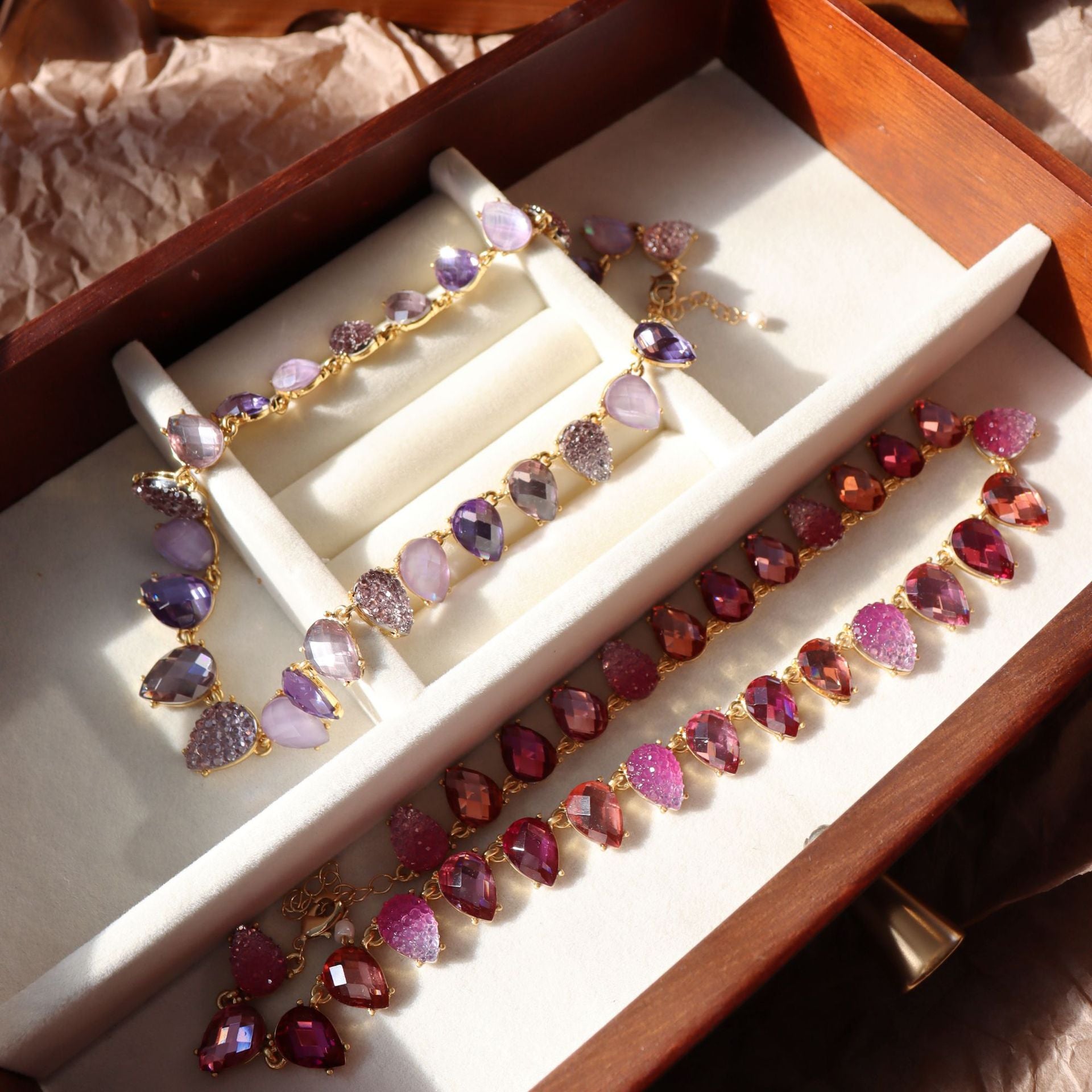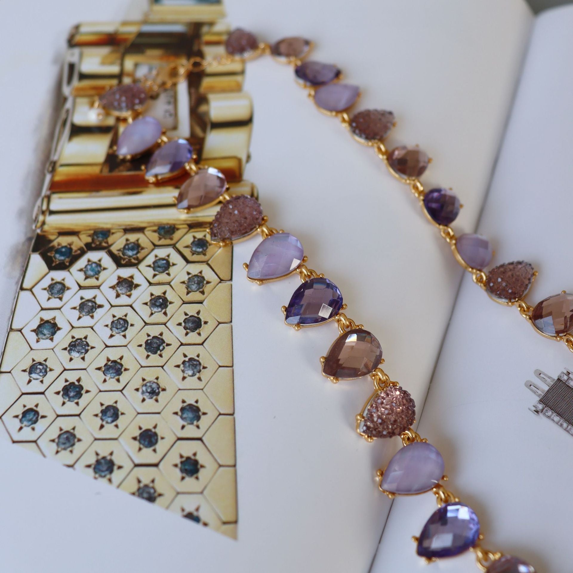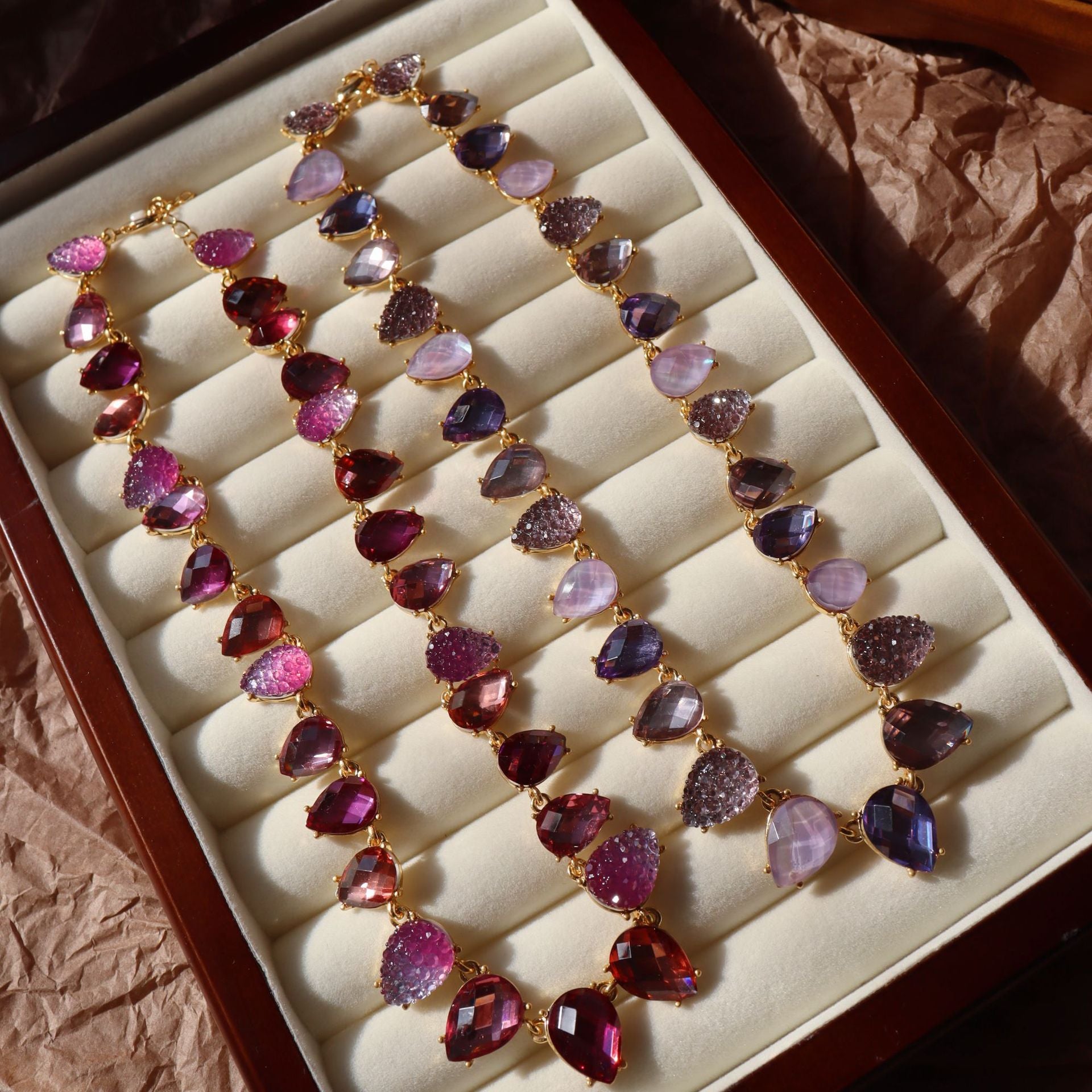 تتألق هذه القلادة المستوحاة من الطراز العتيق ببلورات زجاجية براقة وأحجار مصقولة بأسلوب نمساوي، بأطياف غنية من الوردي والأرجواني والبنفسجي. كل حجر على شكل كمثرى أو دائري يُثبت يدوياً داخل إطار من النحاس المطلي بالذهب، ليشكل تدرجاً متناغماً بين الضوء والظل.