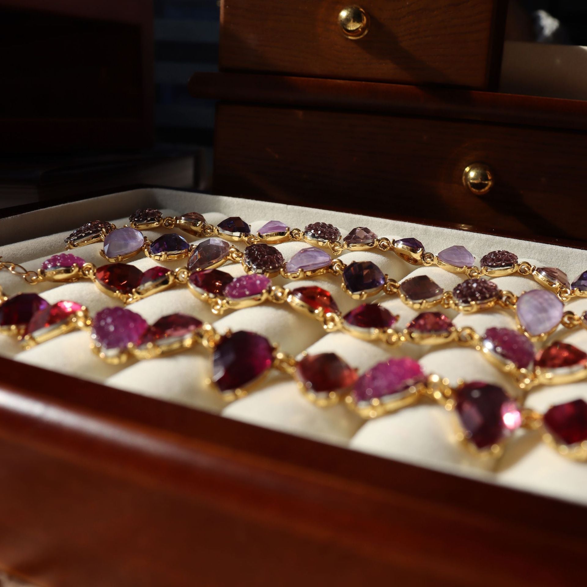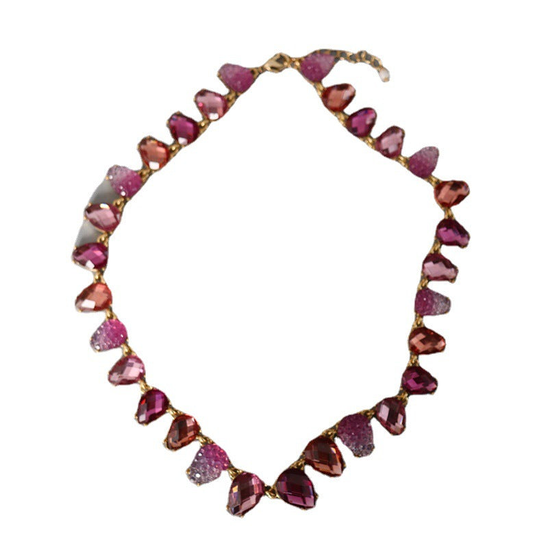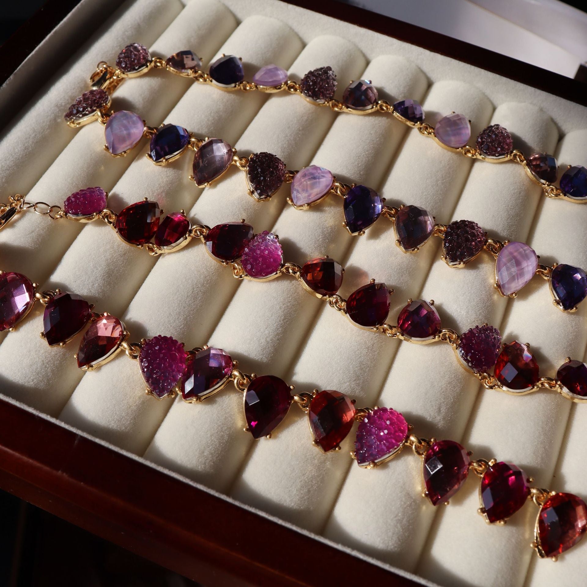 تتألق هذه القلادة المستوحاة من الطراز العتيق ببلورات زجاجية براقة وأحجار مصقولة بأسلوب نمساوي، بأطياف غنية من الوردي والأرجواني والبنفسجي. كل حجر على شكل كمثرى أو دائري يُثبت يدوياً داخل إطار من النحاس المطلي بالذهب، ليشكل تدرجاً متناغماً بين الضوء والظل.