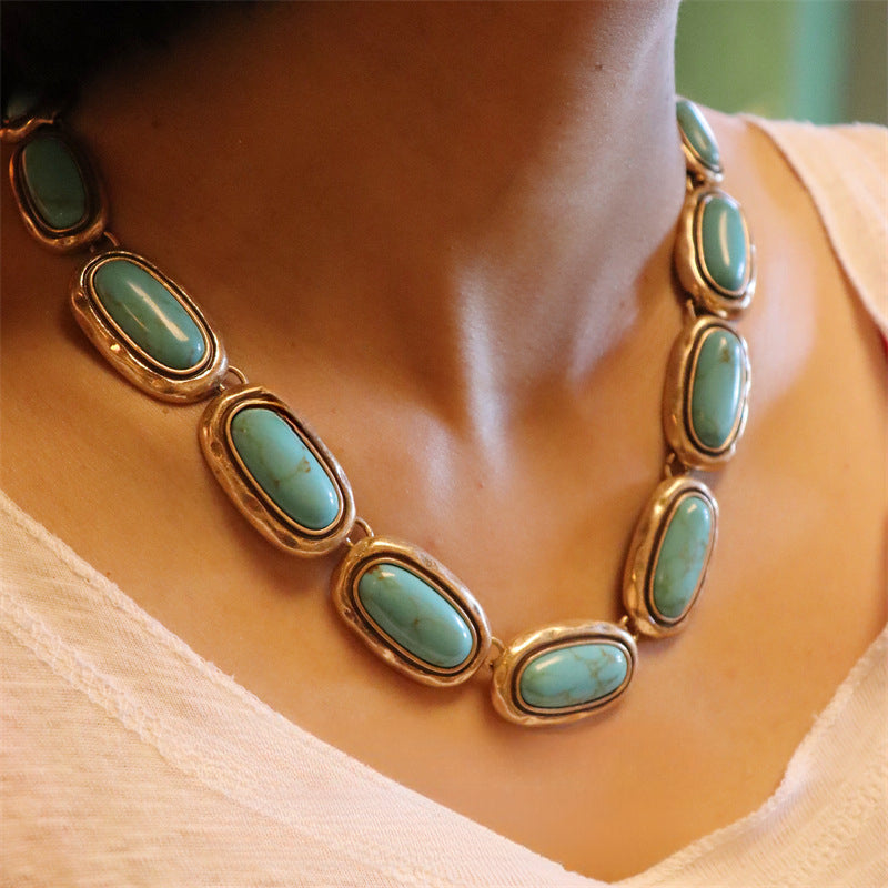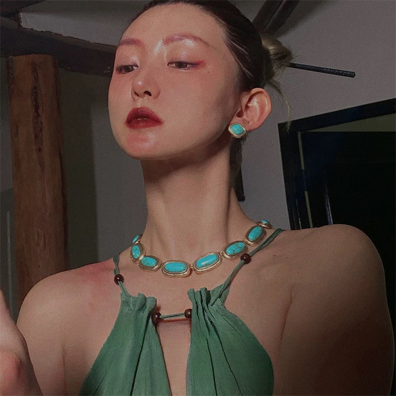 طقم عقد وأقراط بتصميم عتيق وحجر الفيروز اليدوي