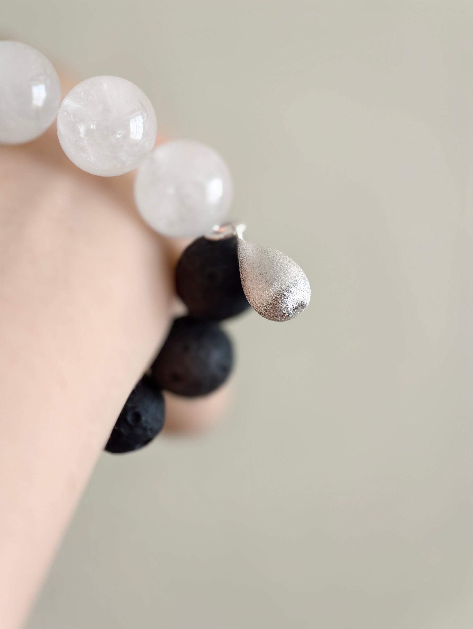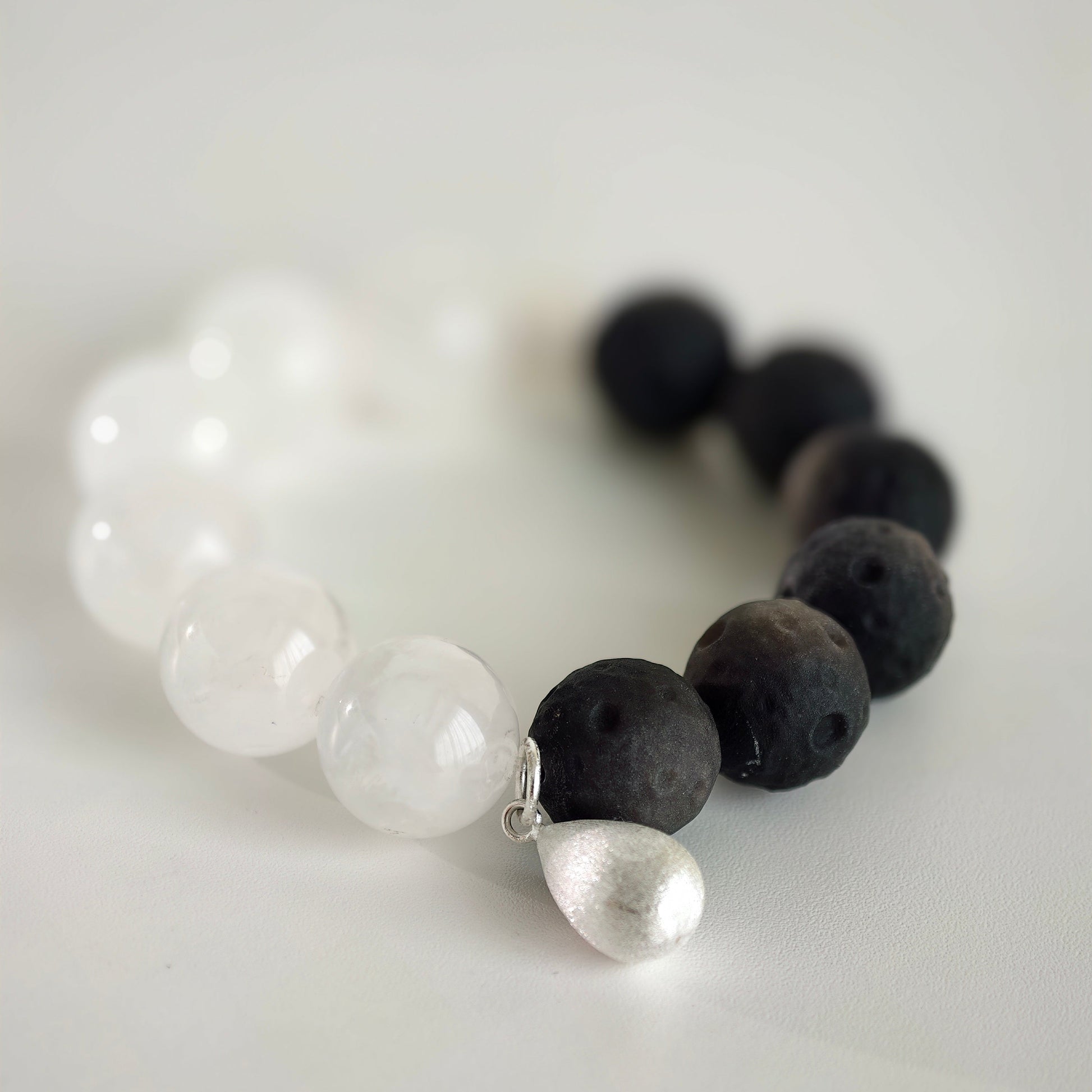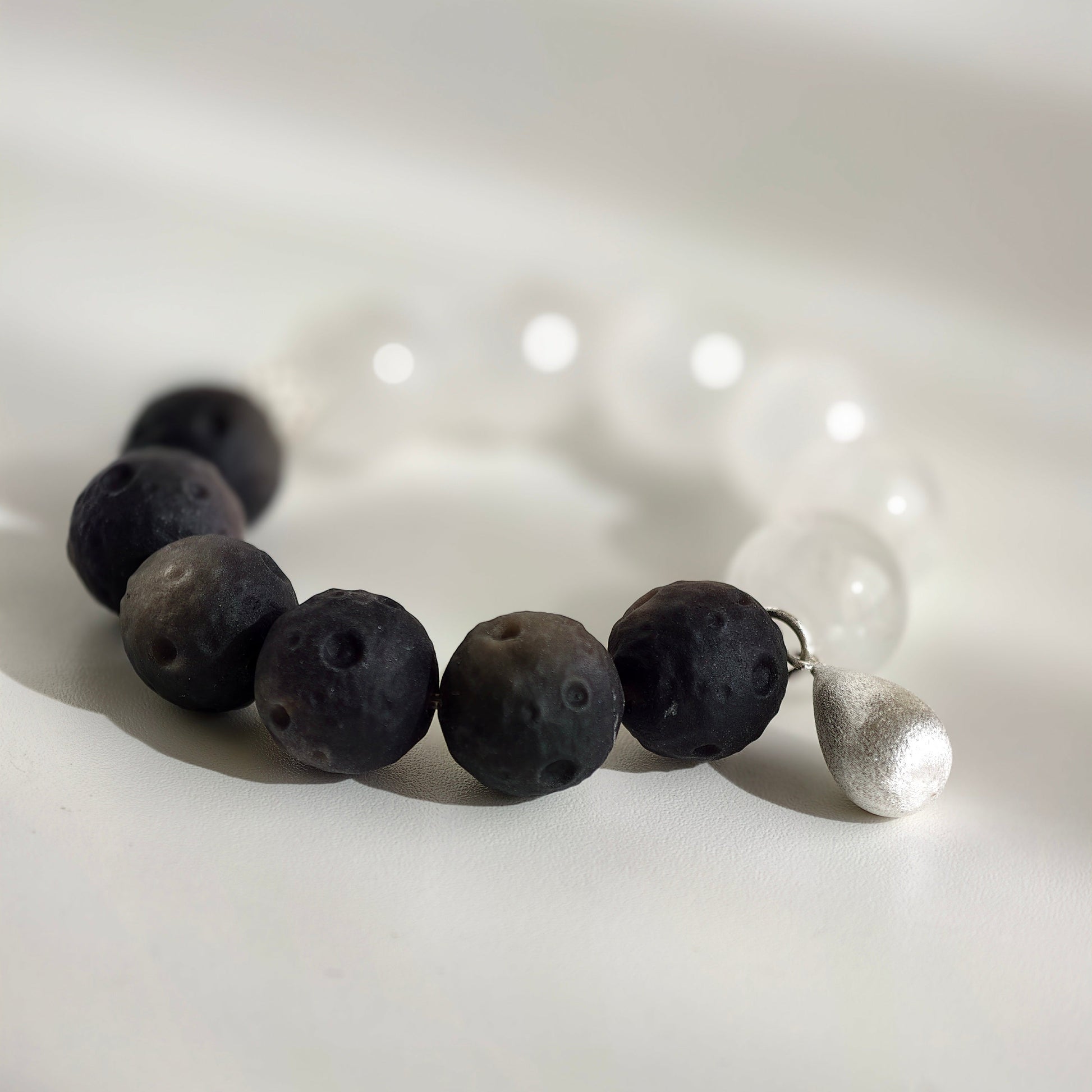 A bracelet that feels like the quiet space between light and darkness — clean, cosmic, and minimalist. The icy clarity of white phantom quartz meets the raw, cratered surface of black silver meteorite, creating a striking contrast of transparency and texture. Together they form a design that feels both celestial and grounding, like moonlight falling onto volcanic stone.