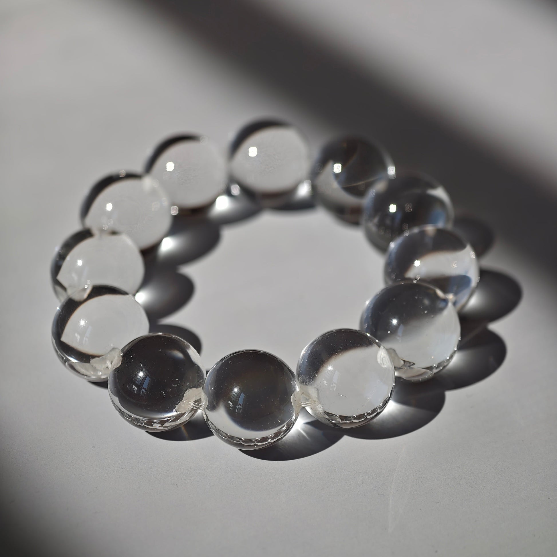 を使用して連ねられたデザインは、清潔でシームレスであり、各ビーズが完璧に整列して浮いているように見えます。このミニマリストな構造は水晶の純粋さを引き立て、ブレスレットに落ち着いた瞑想的な存在感を与えます。 「牛鼻結び技術」, the design stays clean and seamless, with each bead appearing to hover in perfect alignment. This minimalist structure enhances the purity of the quartz and gives the bracelet a calm, meditative presence.