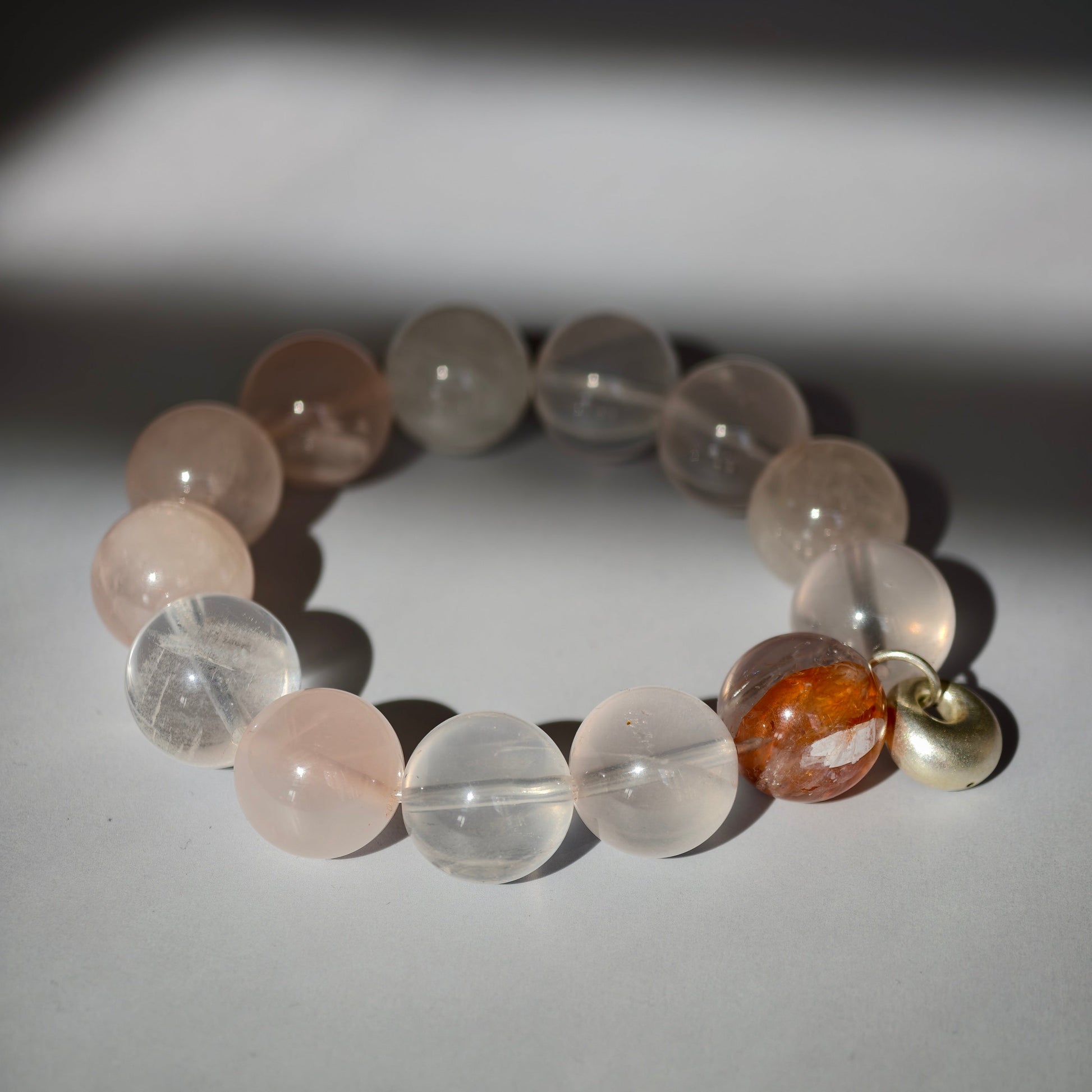 ピンクの霧ときらめく赤に包まれたこのブレスレットは、恋する心のやさしい炎を映し出します——朝もやを温める花びらのように、または柔らかな光に囁くラブレターのように。