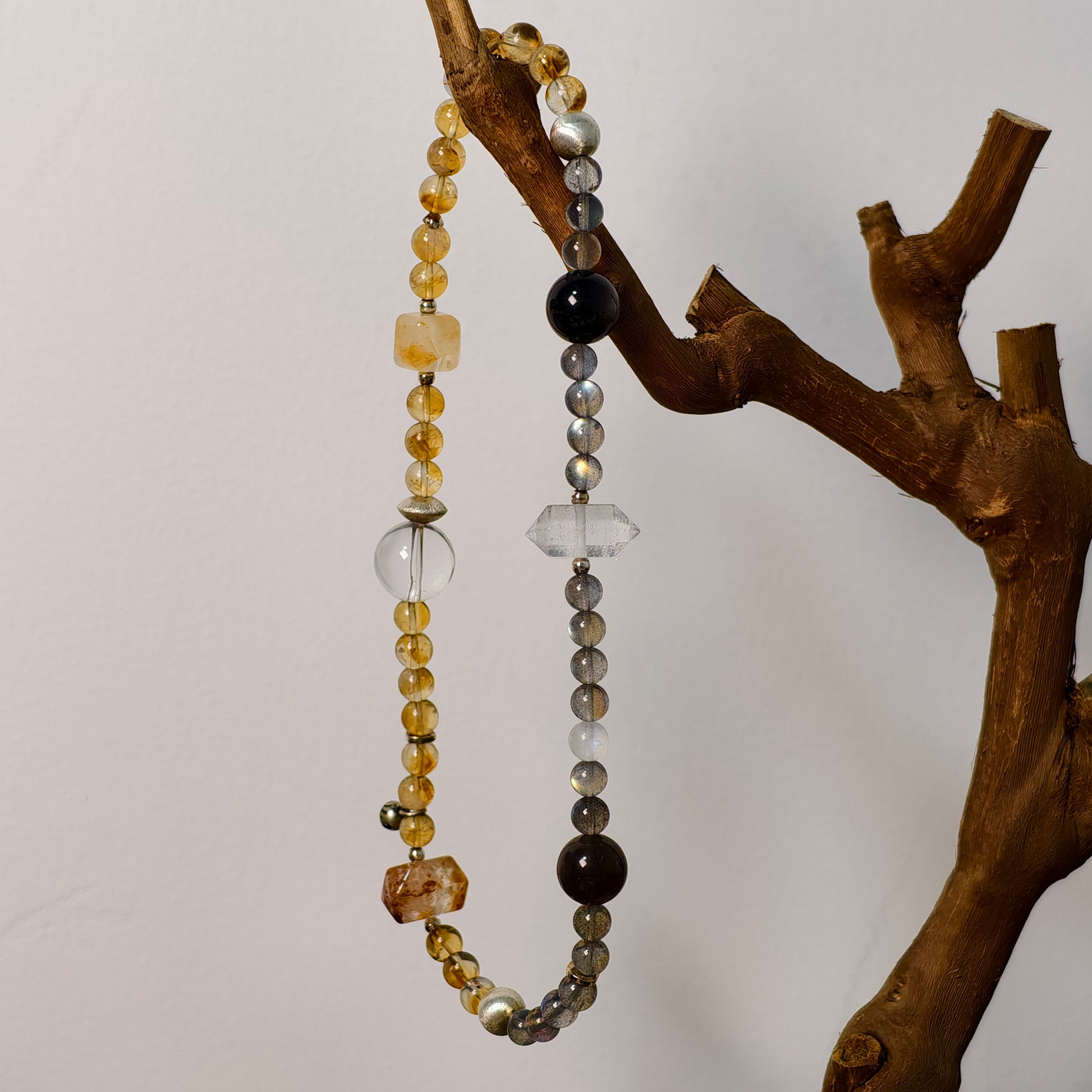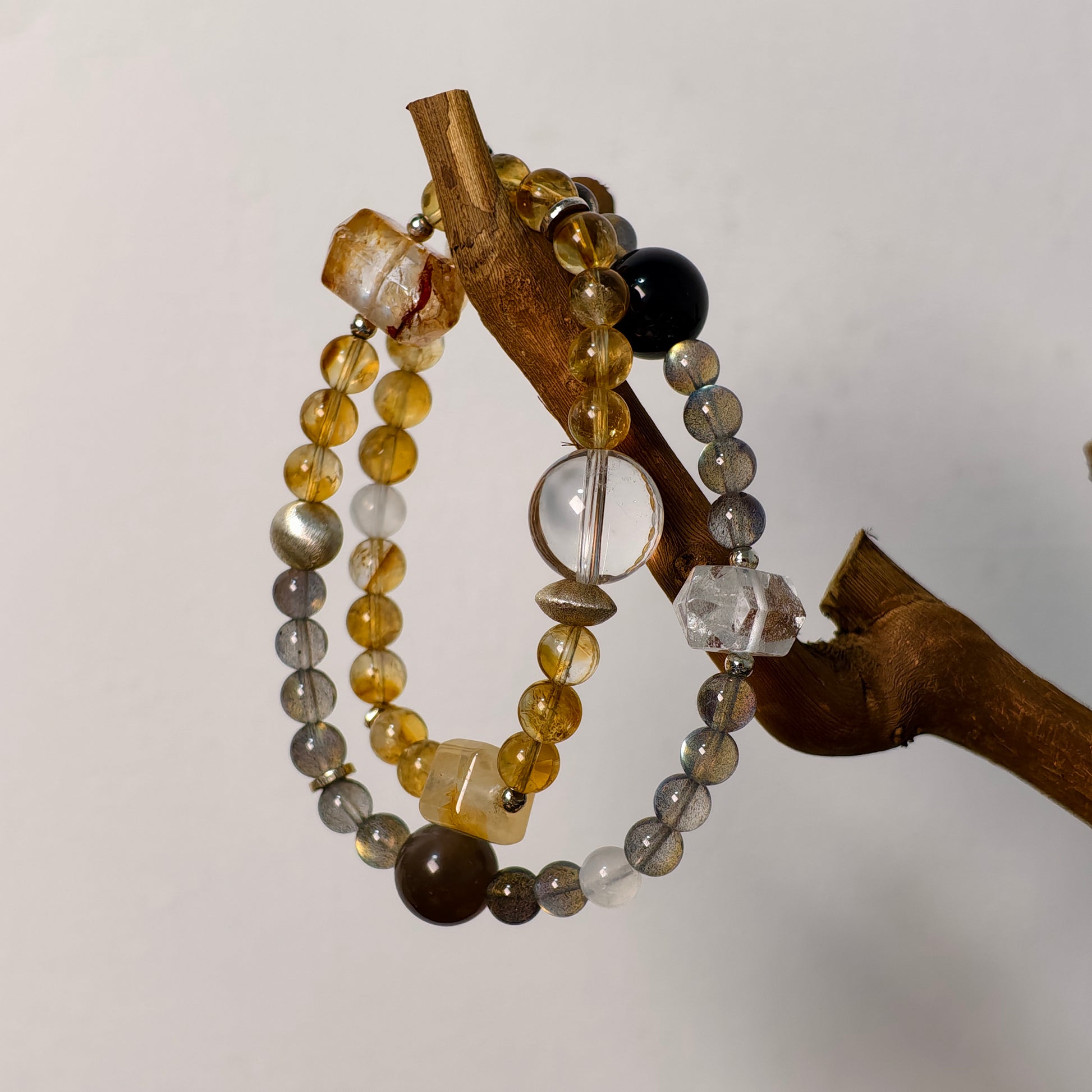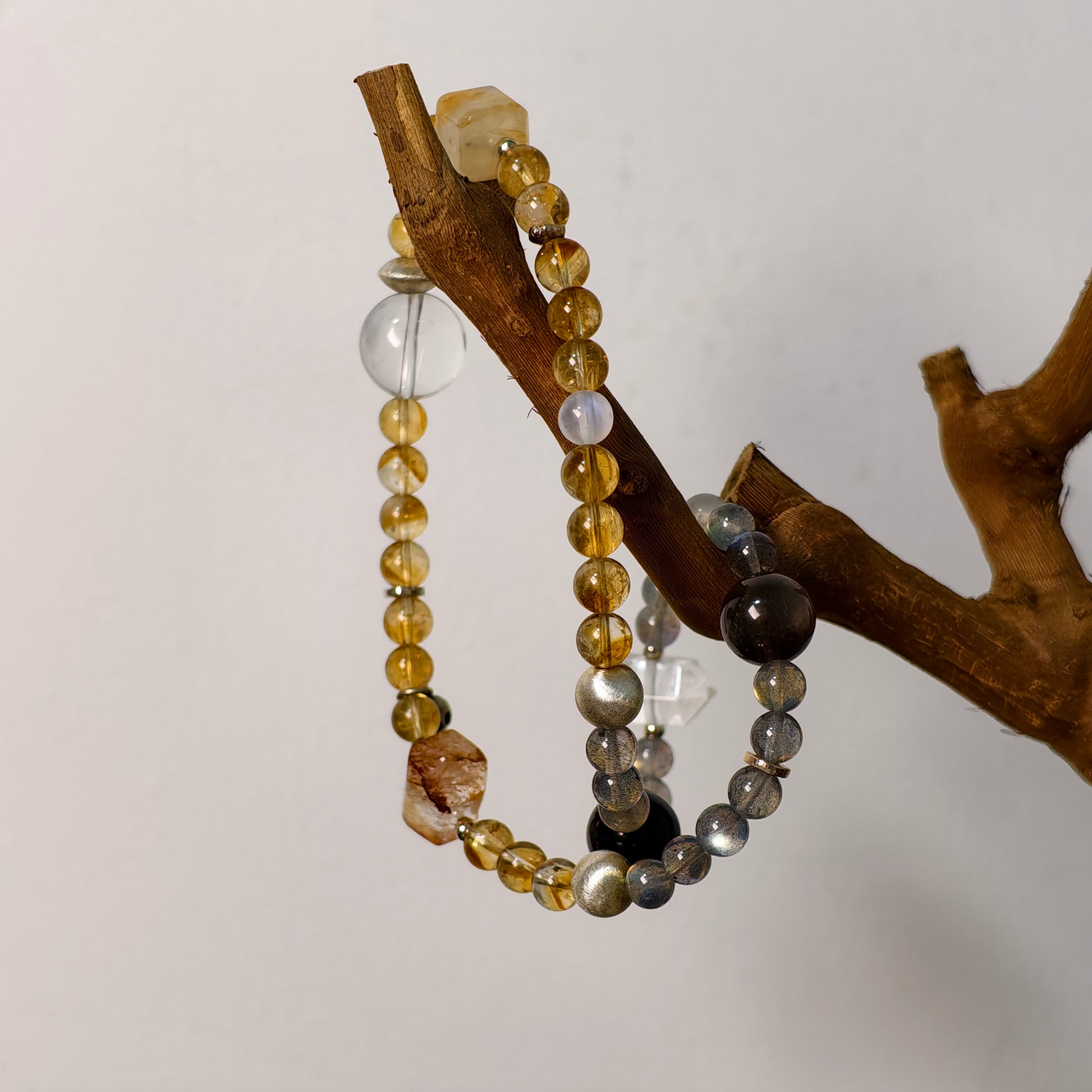 Solar Veinsは、洞察を呼び覚まし、エネルギーを大地に根づかせるために丁寧に組み上げられた二重巻きのブレスレットです。輝くイエローアゼツライトとゴールデンルチルクォーツ、柔らかなブルーグレームーンストーンとクリアクォーツが織りなす光彩。シルバーシーンオブシディアンのアクセントと希少なダブルターミネーテッドインクルージョンが、守護の流れと多次元的な明晰さをもたらします。