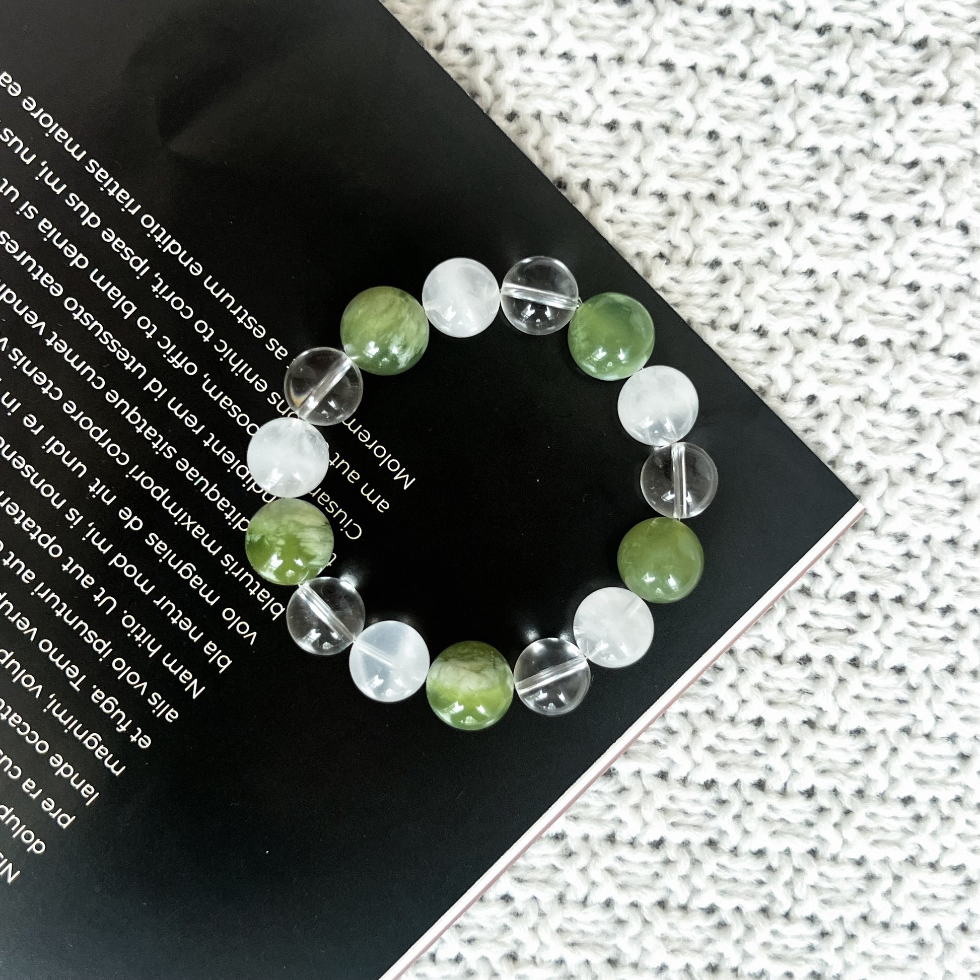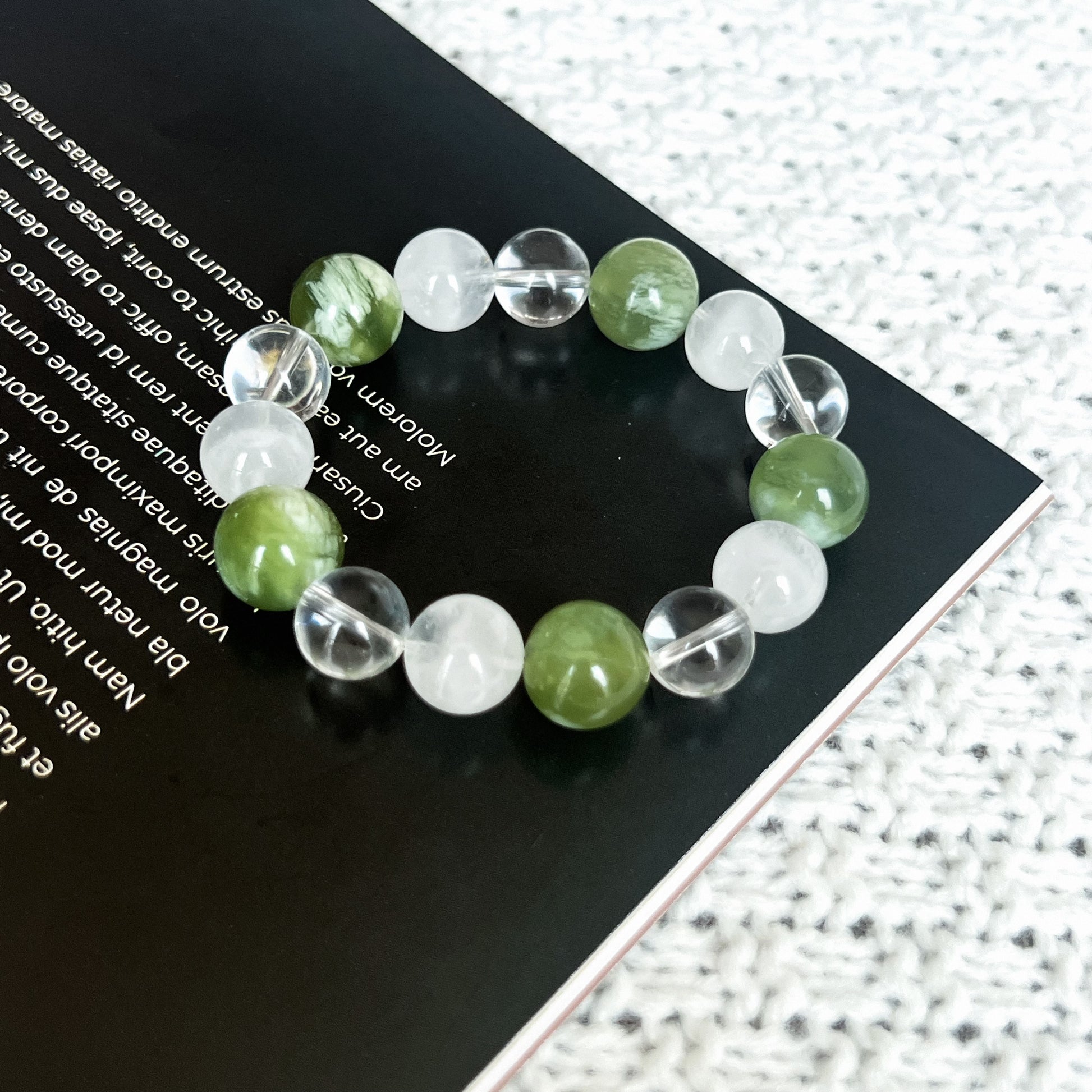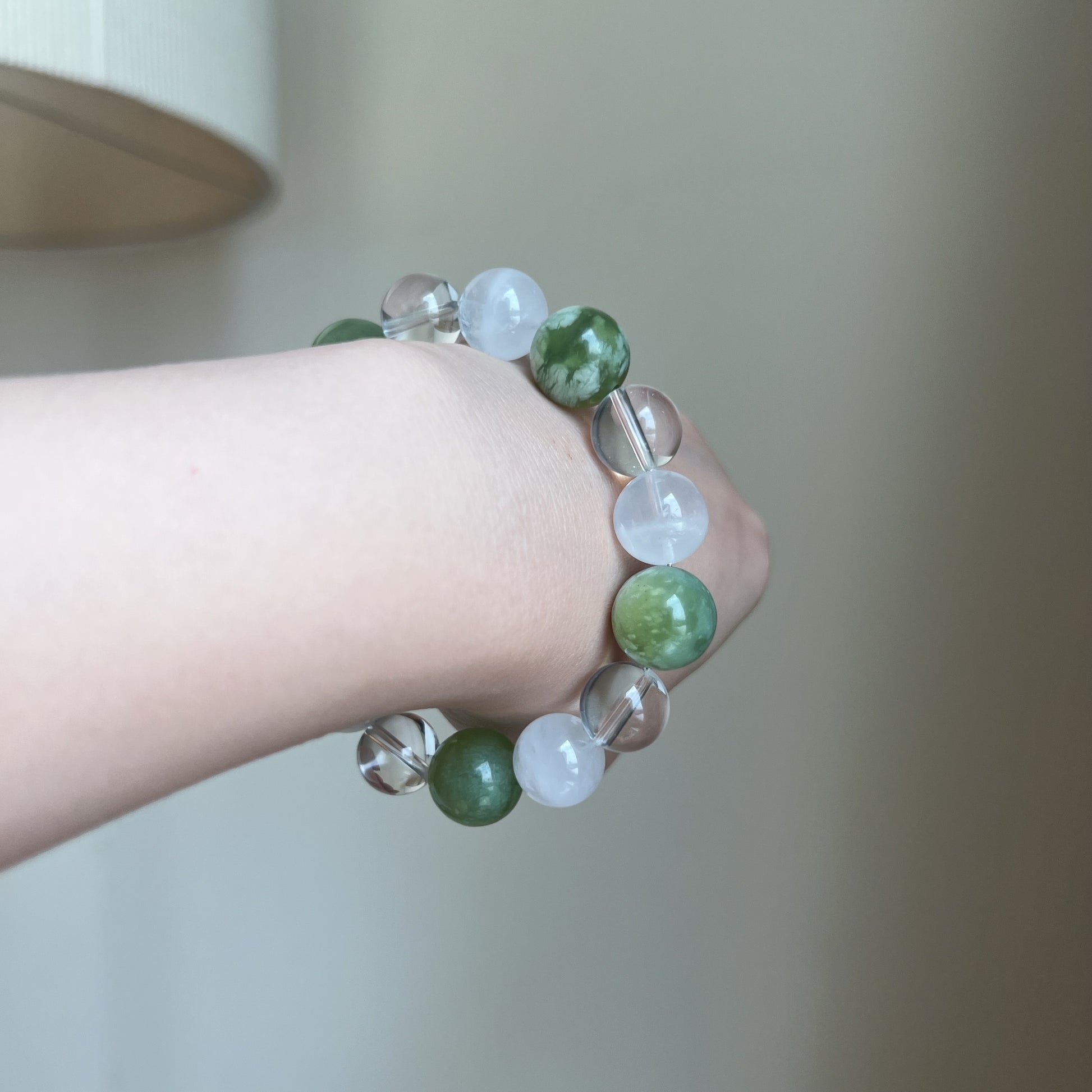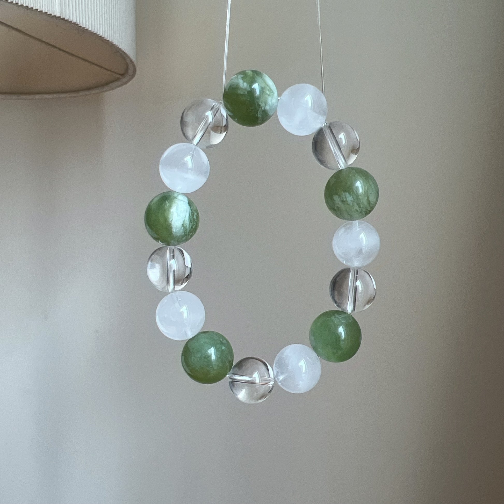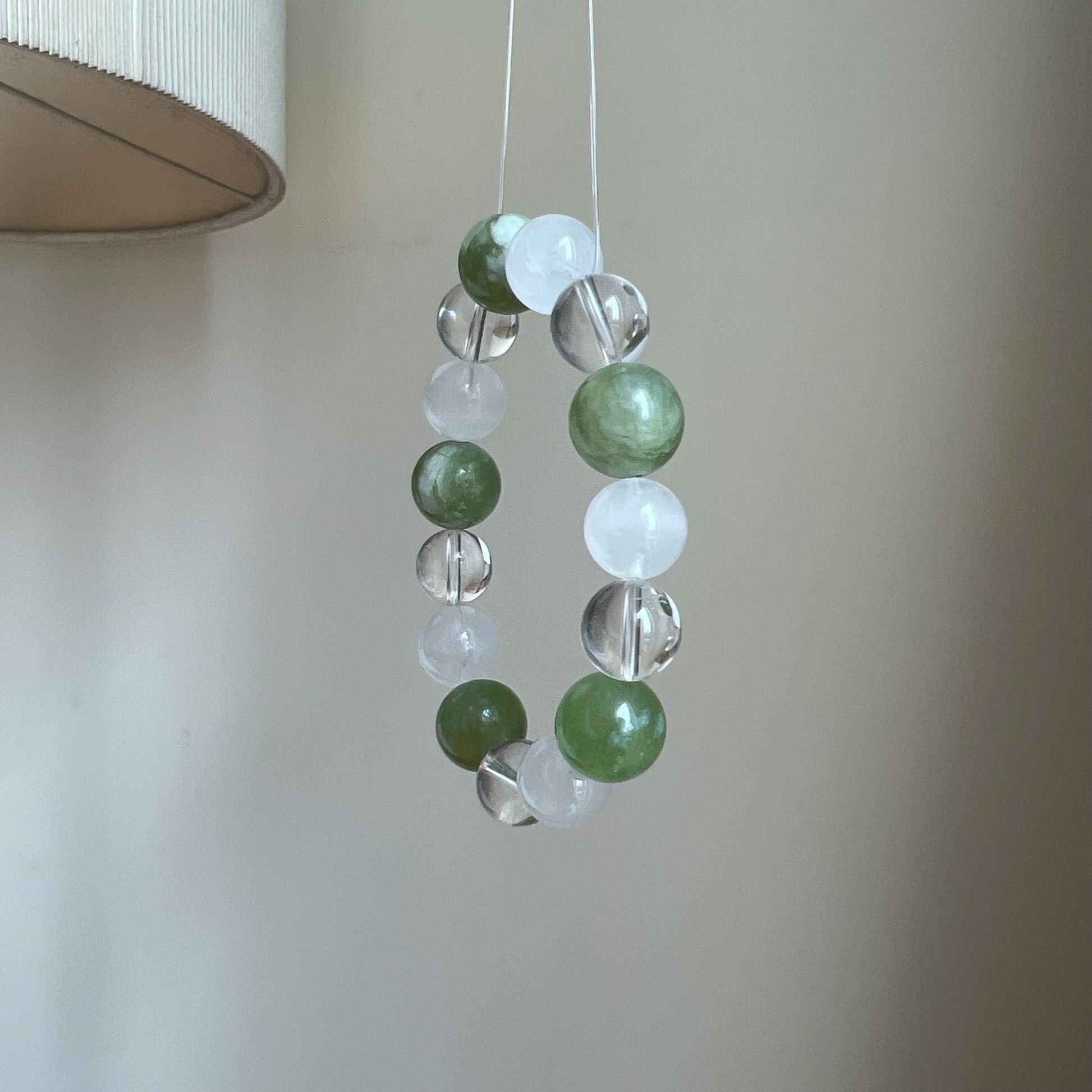 생기 넘치는 초록색 사문석, 부드러운 흰 유령 석영, 그리고 빛나는 투명 석영이 독특한 작품은 숲의 옥과 수정 안개의 고요한 명료함을 조화롭게 결합합니다. 각 구슬은 자연스럽고 독특한 무늬를 지니고 있어 마치 숲속에 새겨진 비밀처럼 균형, 성장, 내면의 평화를 속삭입니다.