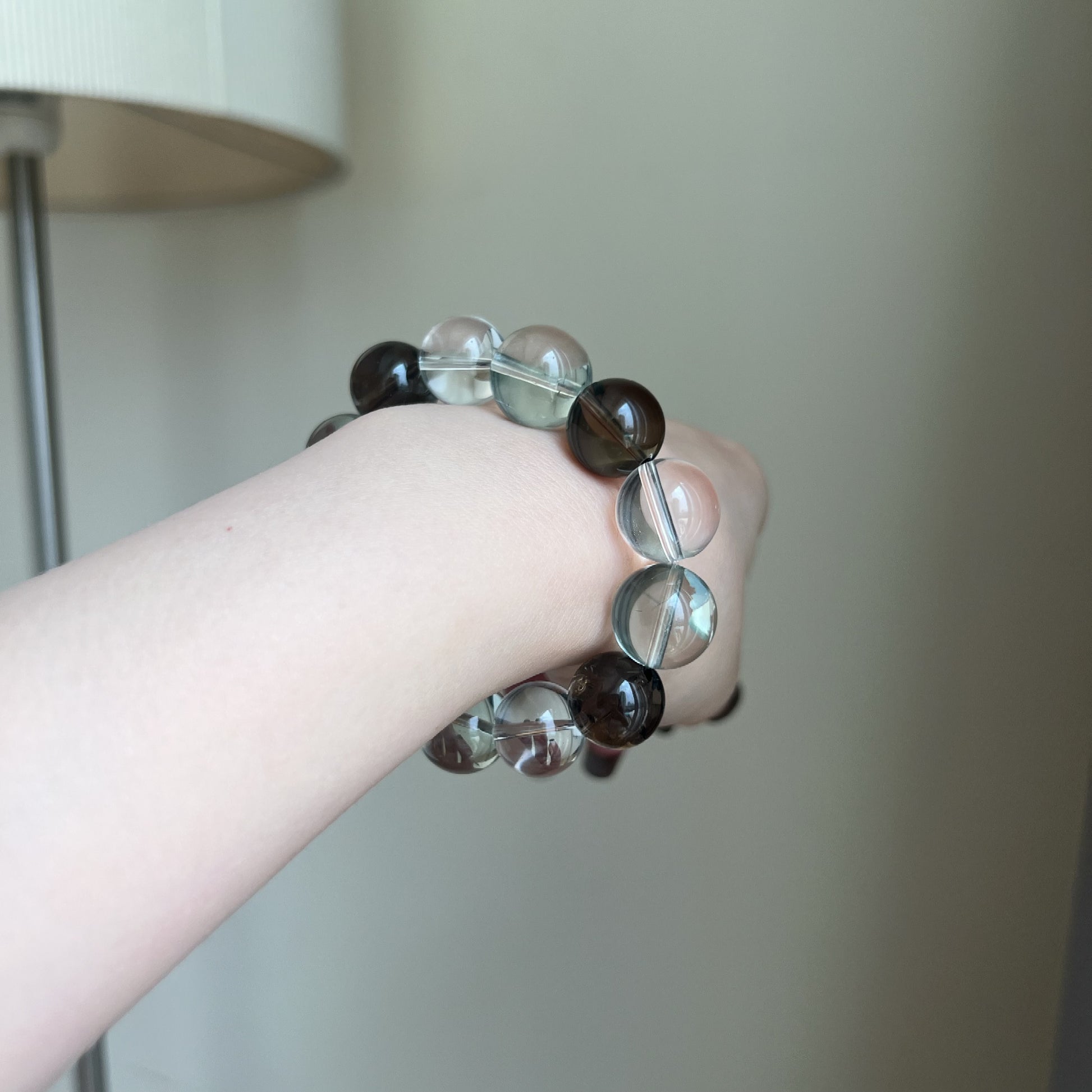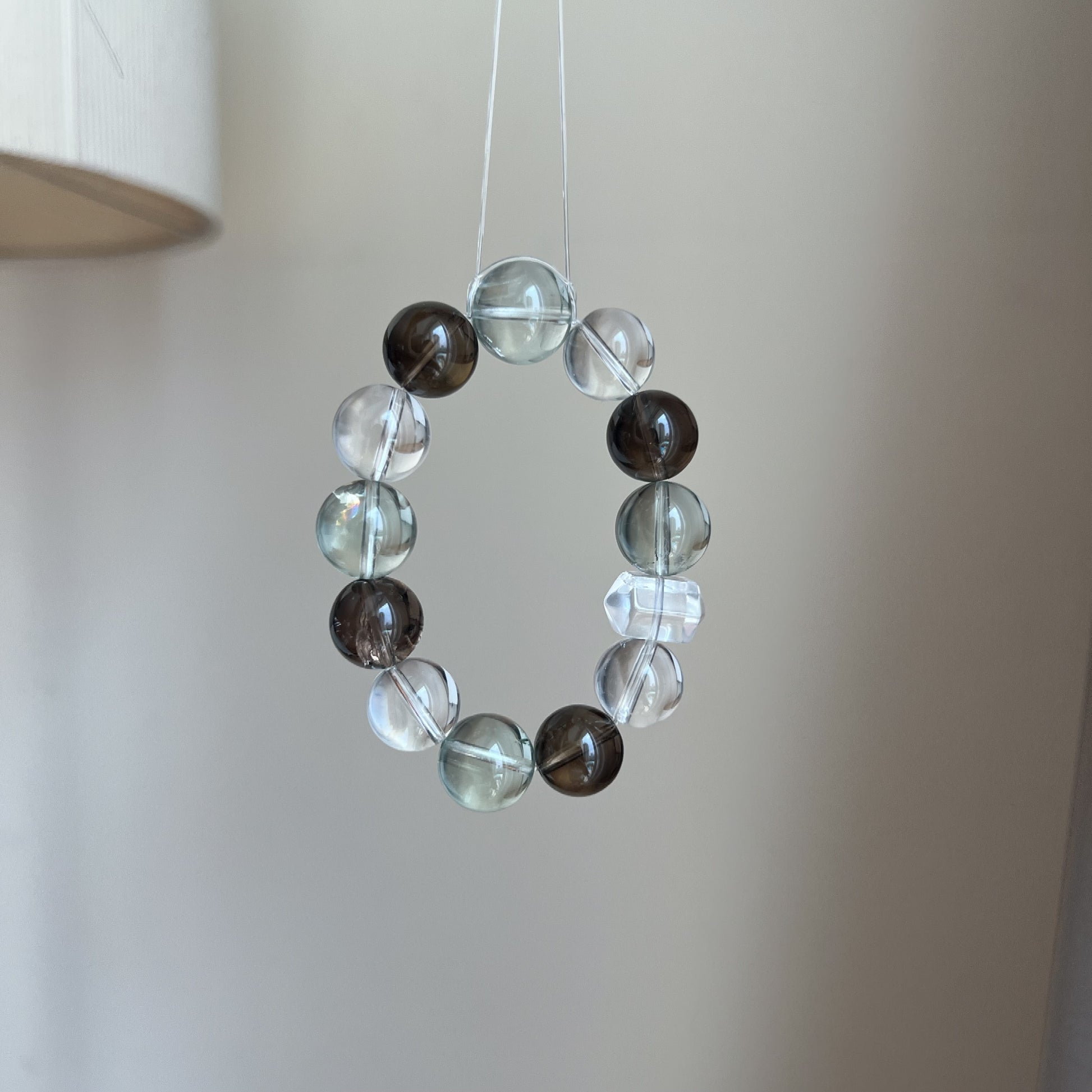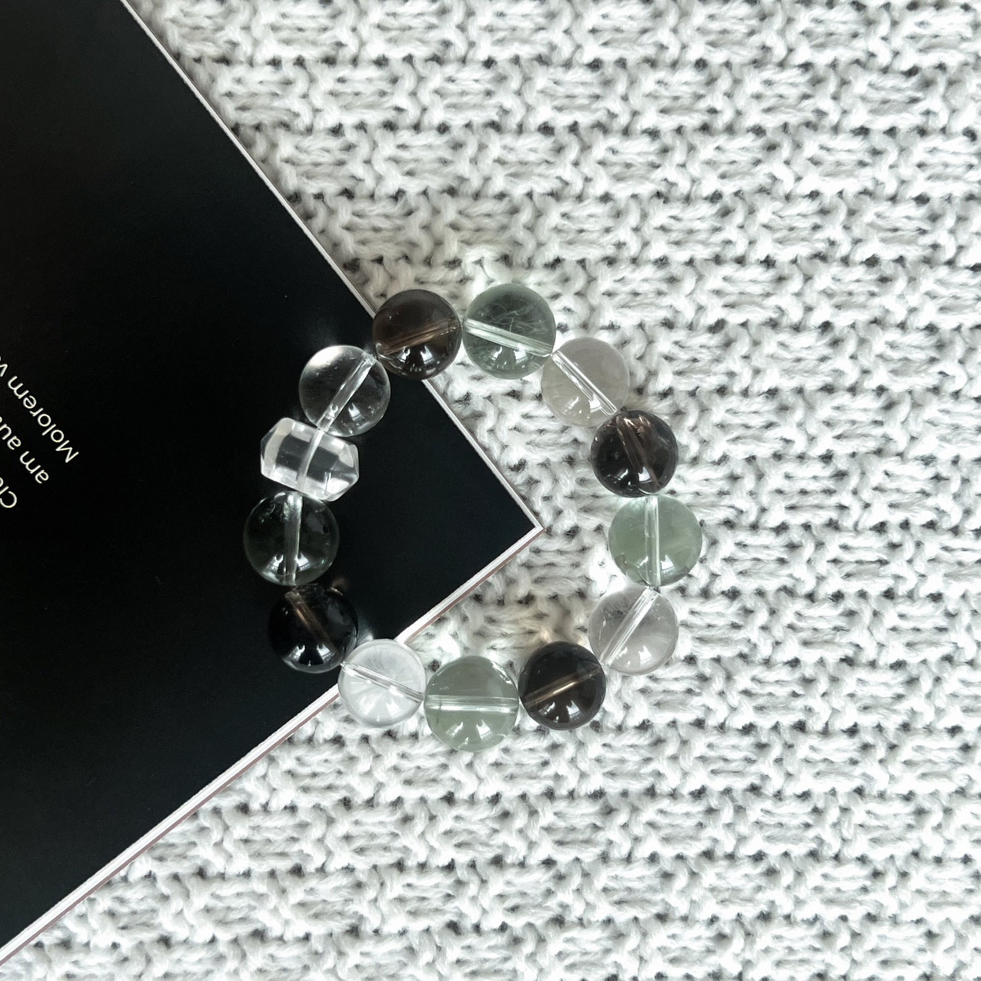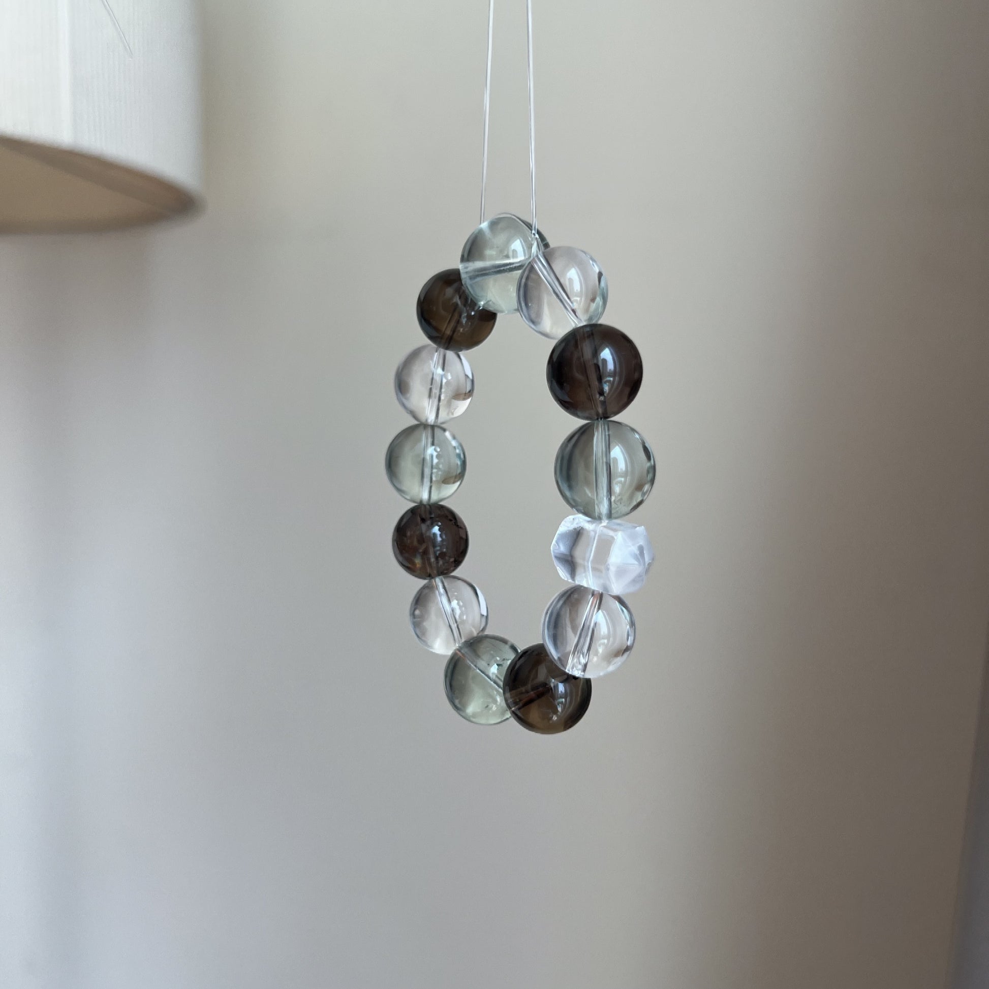 스모키 쿼츠 구슬은 나무 그늘처럼 안정적이고 차분합니다. 그린 플루오라이트는 돌틈 사이에서 생명을 불어넣는 이끼처럼 빛나며, 클리어 쿼츠 구슬은 아침 안개가 숲의 가지 사이를 떠다니듯 반짝입니다.