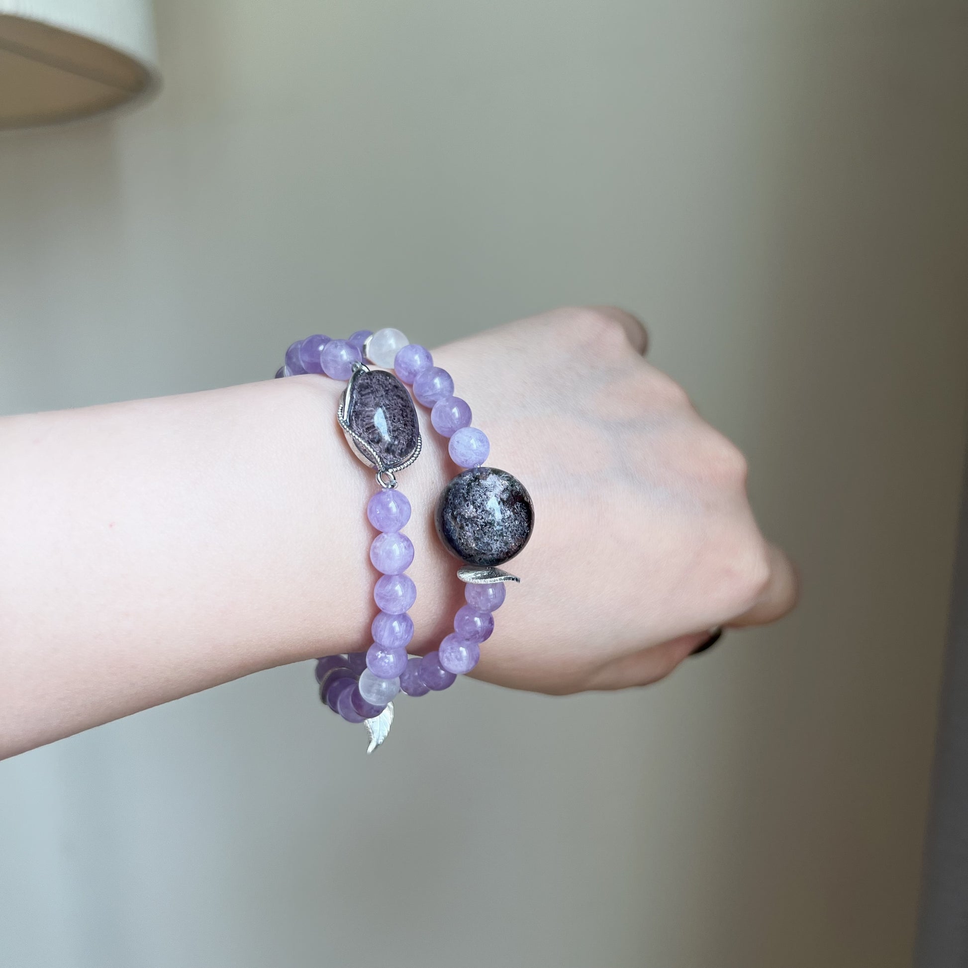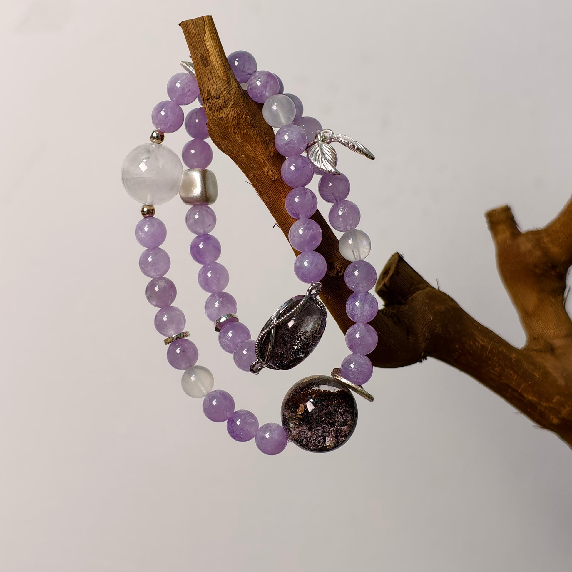 몽환적인 라벤더 안개 속으로 한 걸음 들어가세요, 프로방스 미스트라벤더 암ethyst, 팬텀 암ethyst, 화이트 팬텀 쿼츠로 수작업된 독창적인 더블 랩 크리스탈 팔찌입니다. 이른 아침 안개에 덮인 라벤더 들판의 부드러운 우아함에서 영감을 받아, 각 비드는 자연의 조용한 마법을 담고 있습니다.