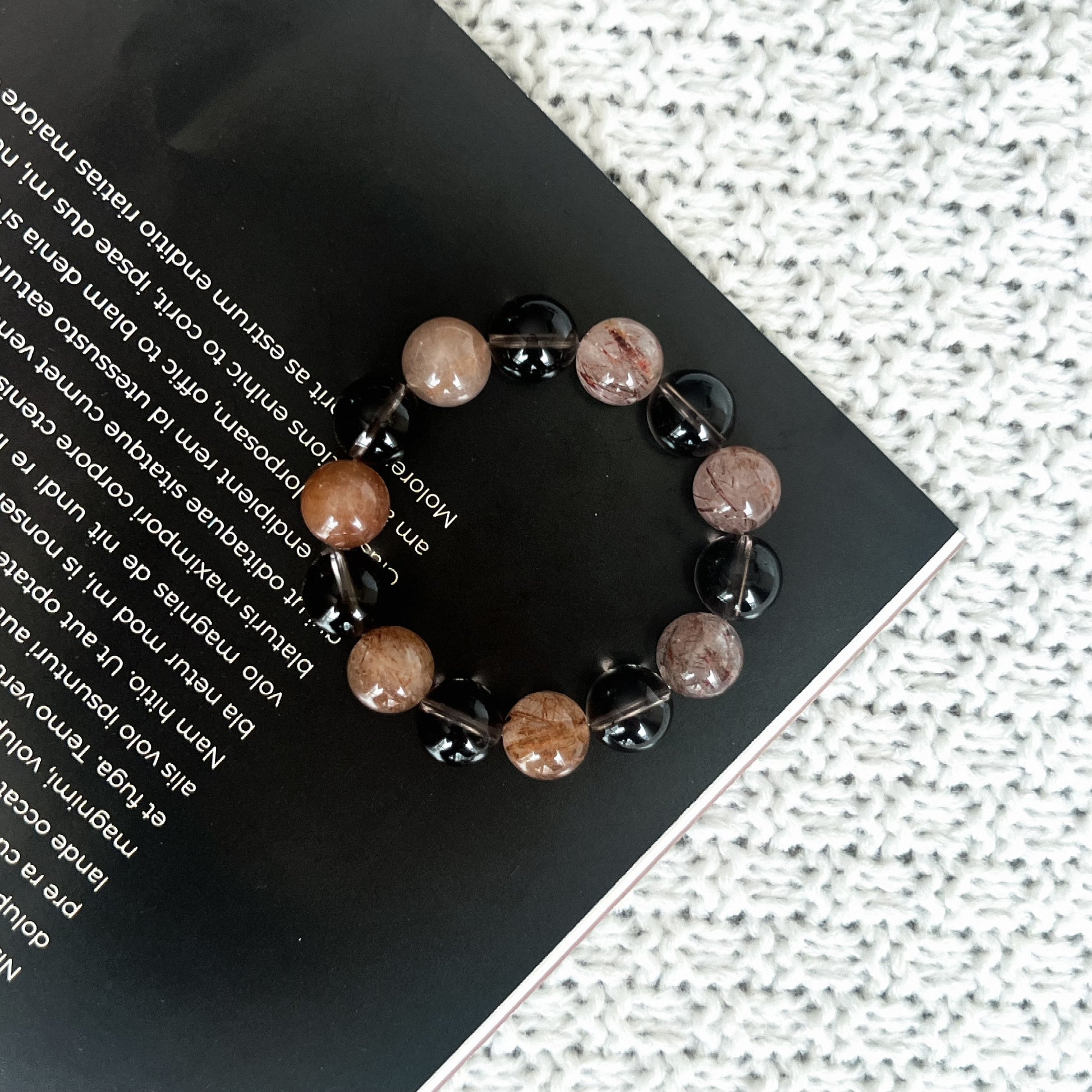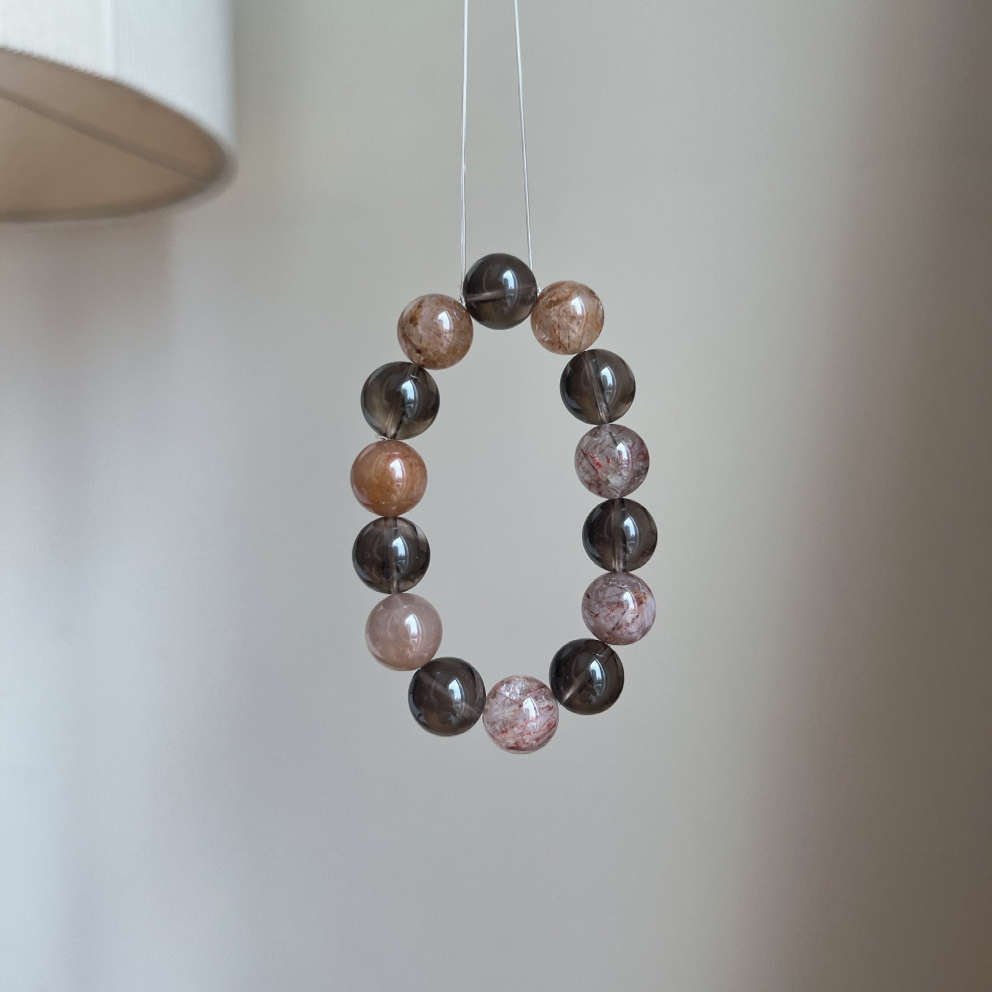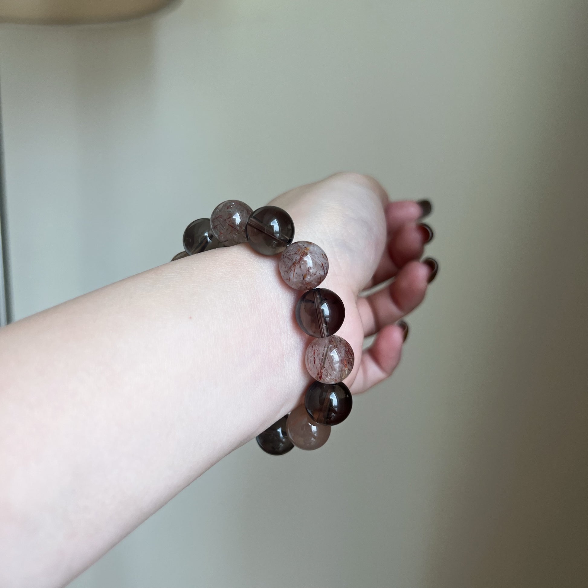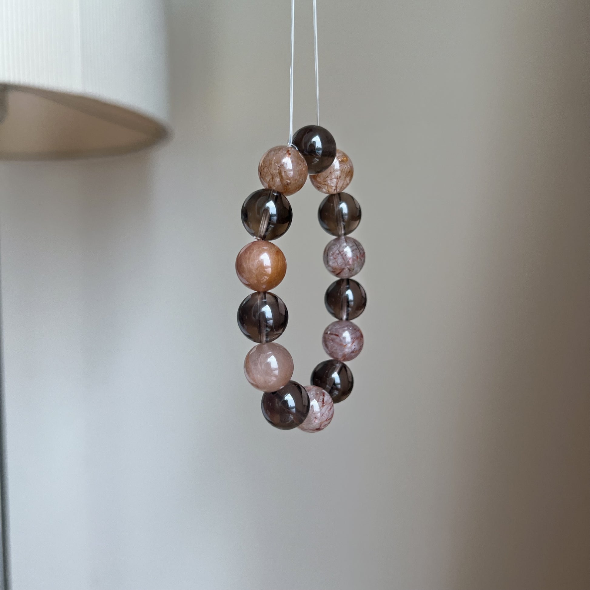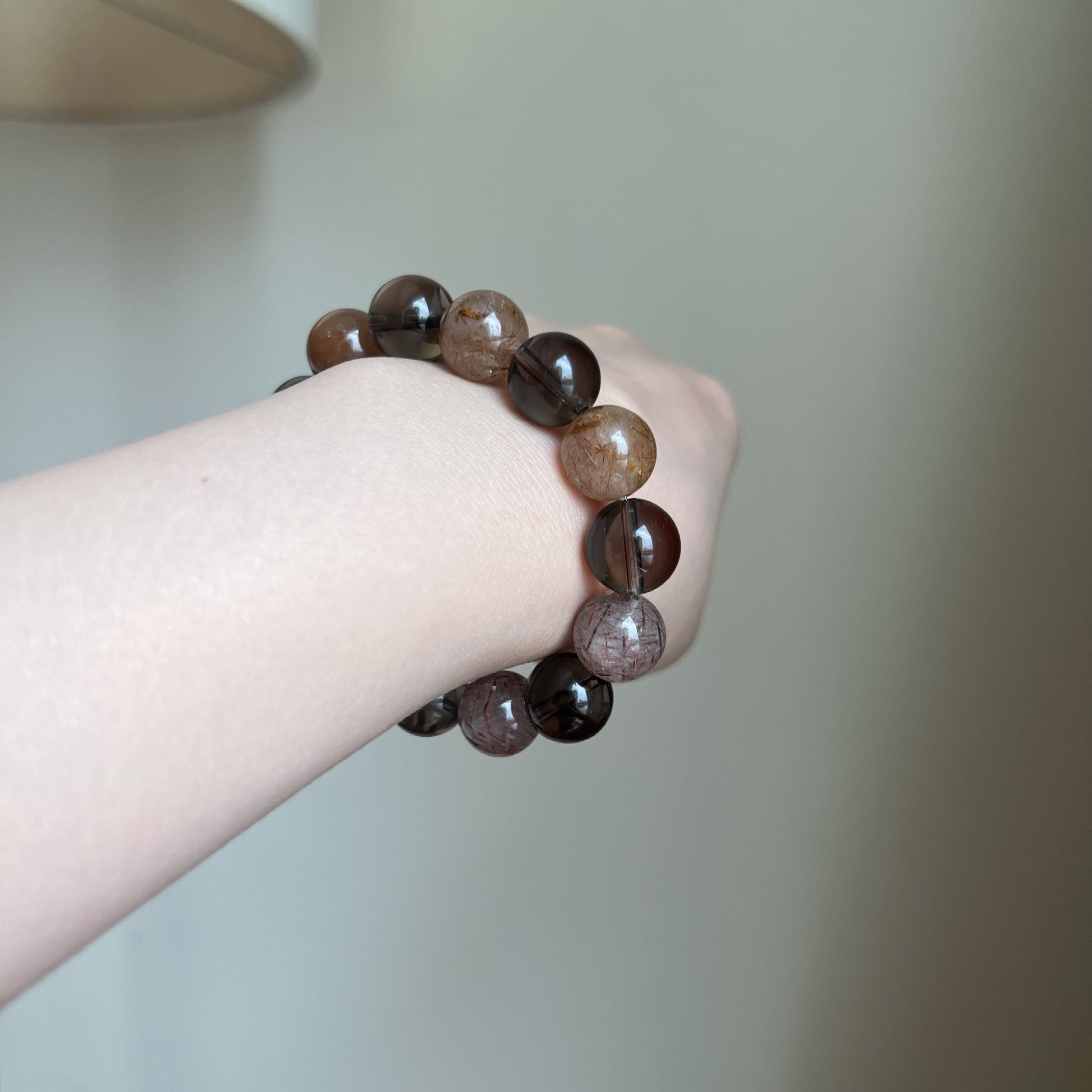 носталь지아가 가득한 우아함의 세계로 들어가세요 시간을 초월한 안식처 스모키 쿼츠, 브라운 루틸레이티드 쿼츠, 그리고 희귀한 적갈색 래빗 헤어 쿼츠가 따뜻하고 자연스러운 조화를 이루는 수작업 크리스탈 팔찌입니다.
