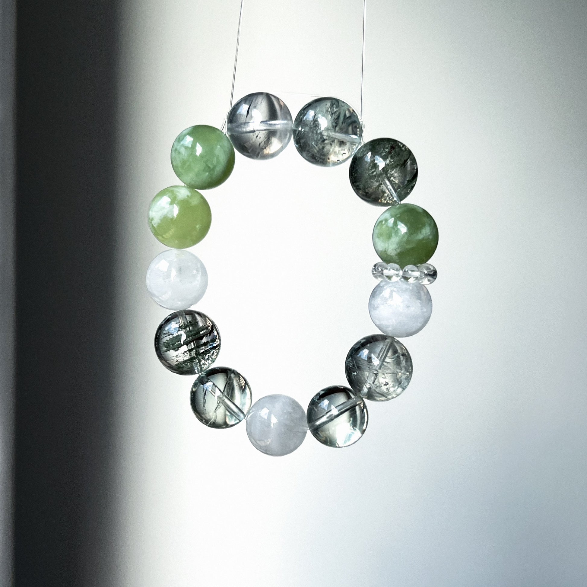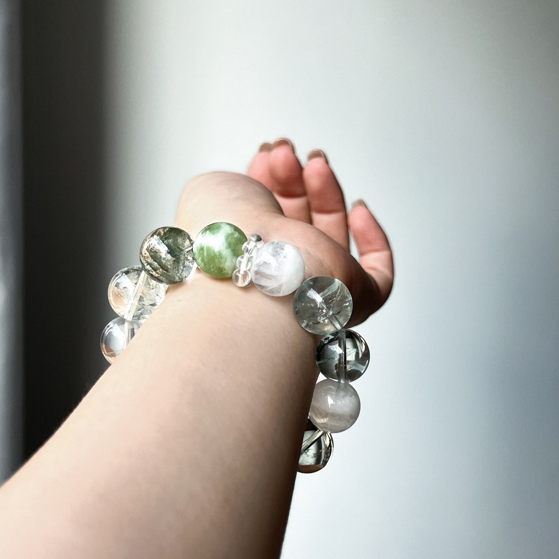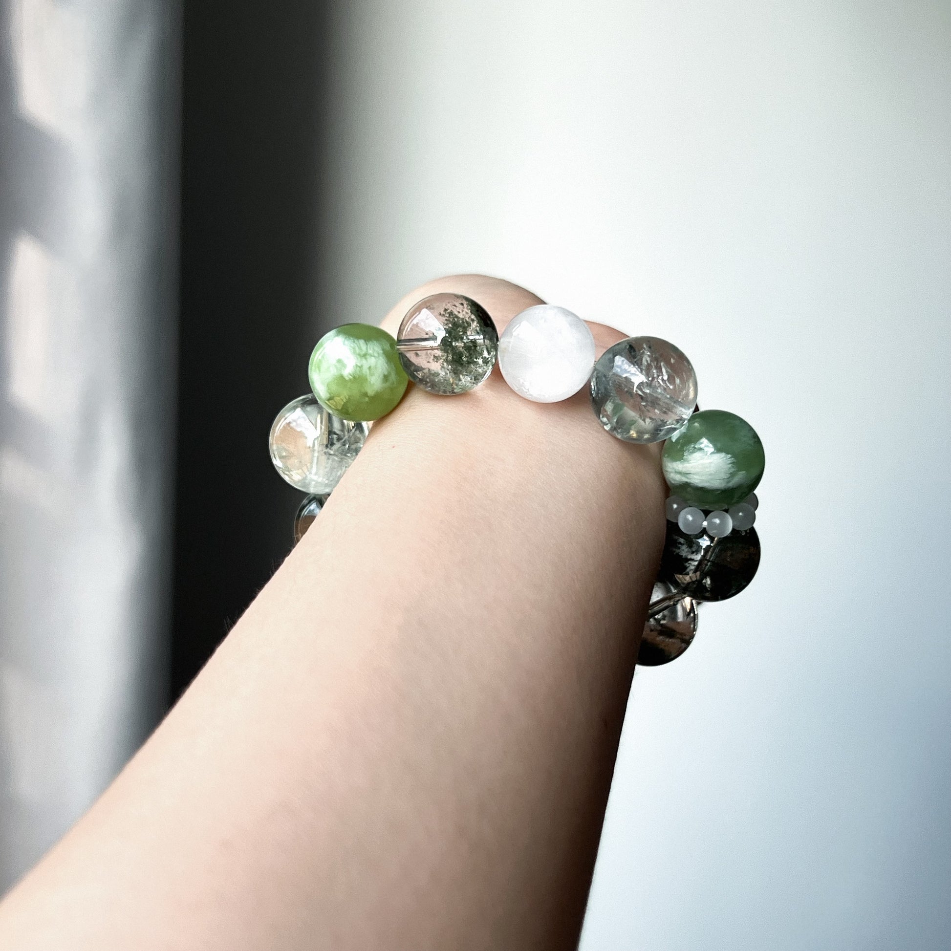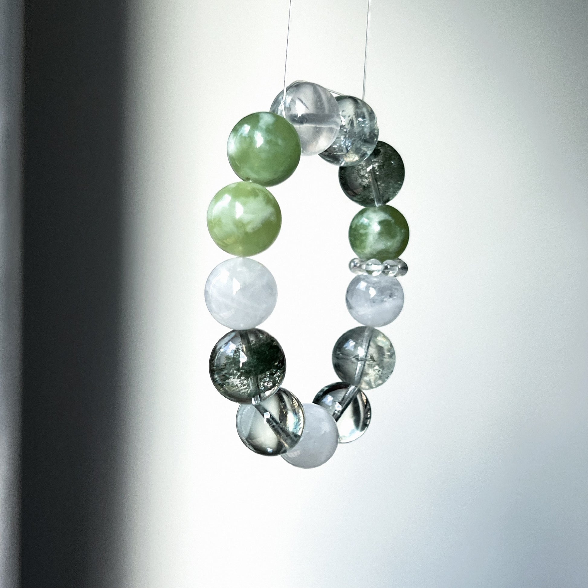 이 오리지널 디자인 크리스탈 팔찌는 화이트 팬텀 쿼츠, 그린 팬텀 쿼츠, 청자빛 제이드, 그리고 희귀한 그린 아제츄라이트의 고요한 조화를 담고 있습니다. 고대 숲과 명상 호흡에서 영감을 받아, 대지의 평온함과 섬세한 힘을 하나로 엮었습니다.
