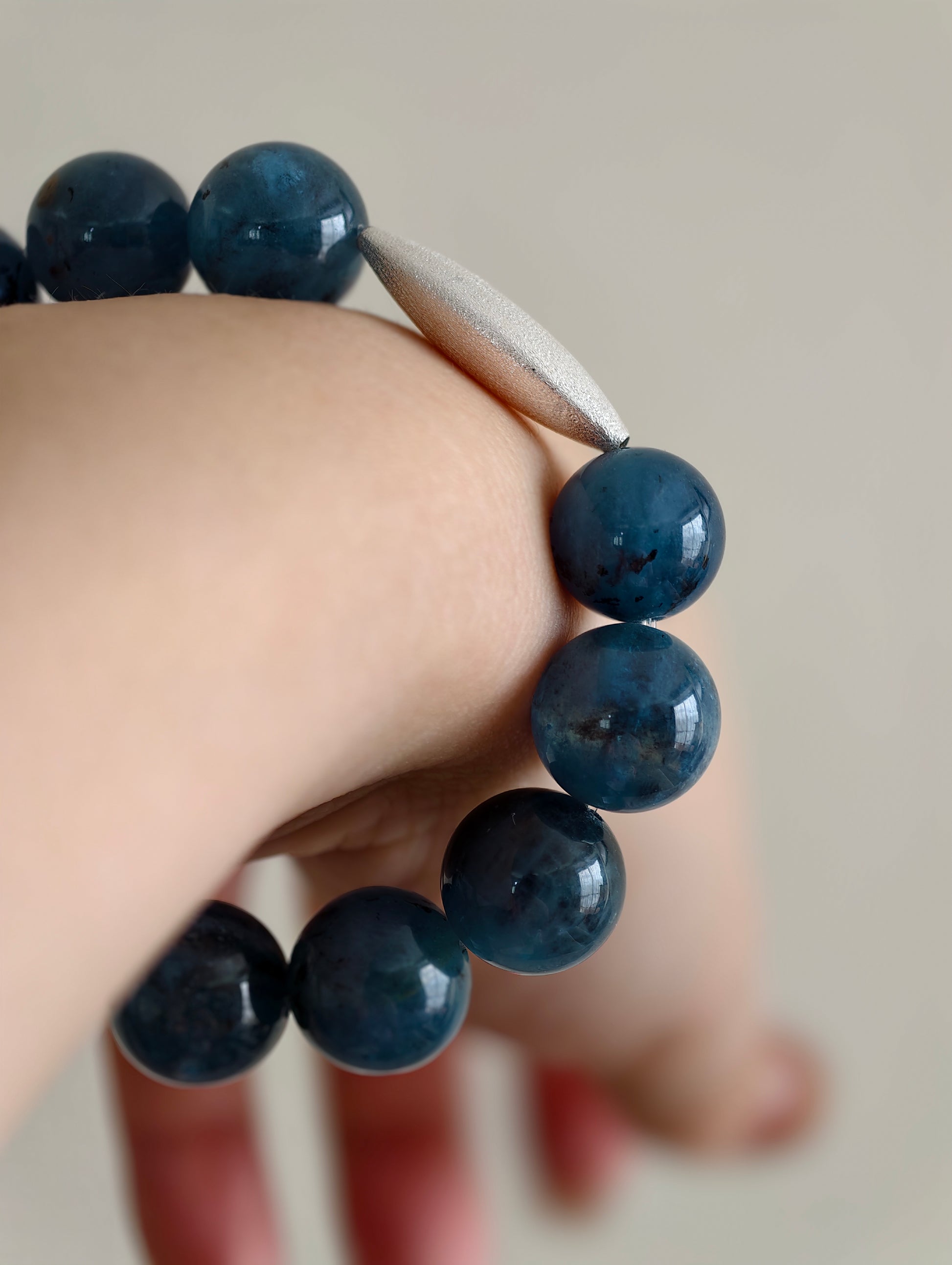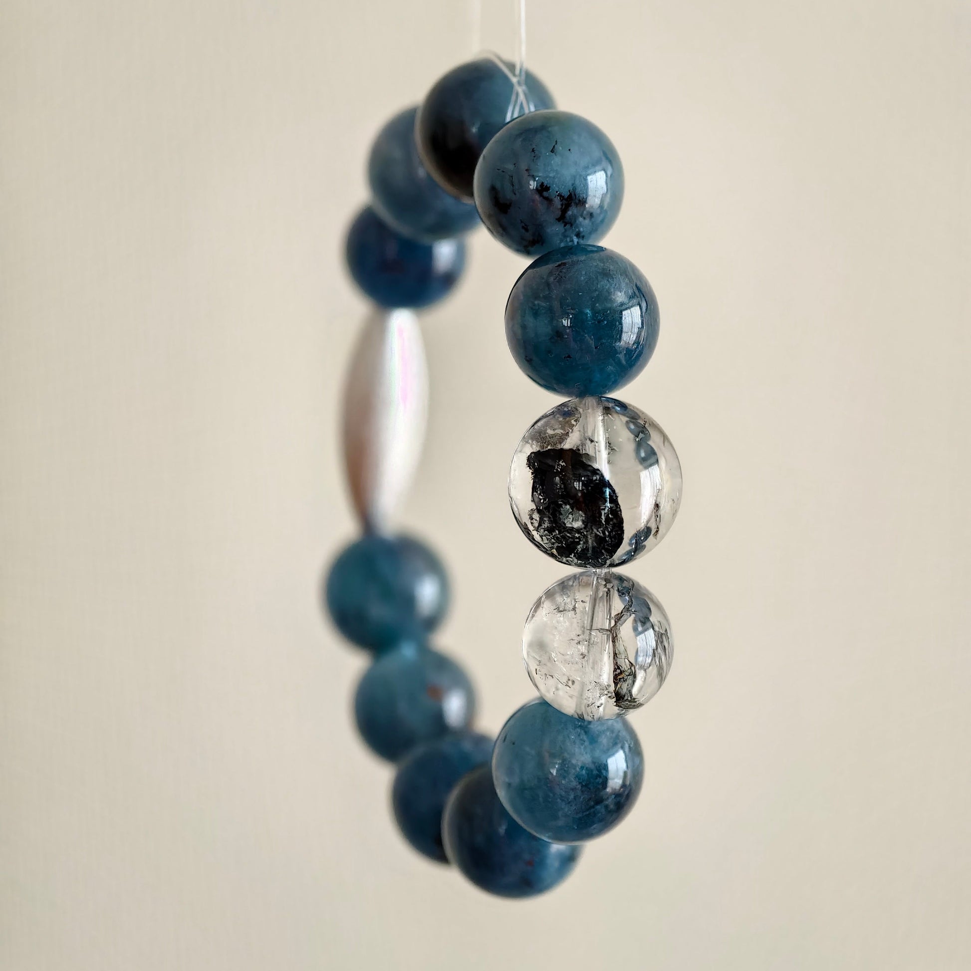 A bracelet inspired by the quiet power of the deep sea — minimal, serene, and endlessly calming. The rich blue tones of the Devil Blue Aquamarine resemble shifting ocean currents, while the Black Flash crystals add depth like shadowed reefs beneath the surface. Together, they create a fluid, meditative balance of darkness and light.