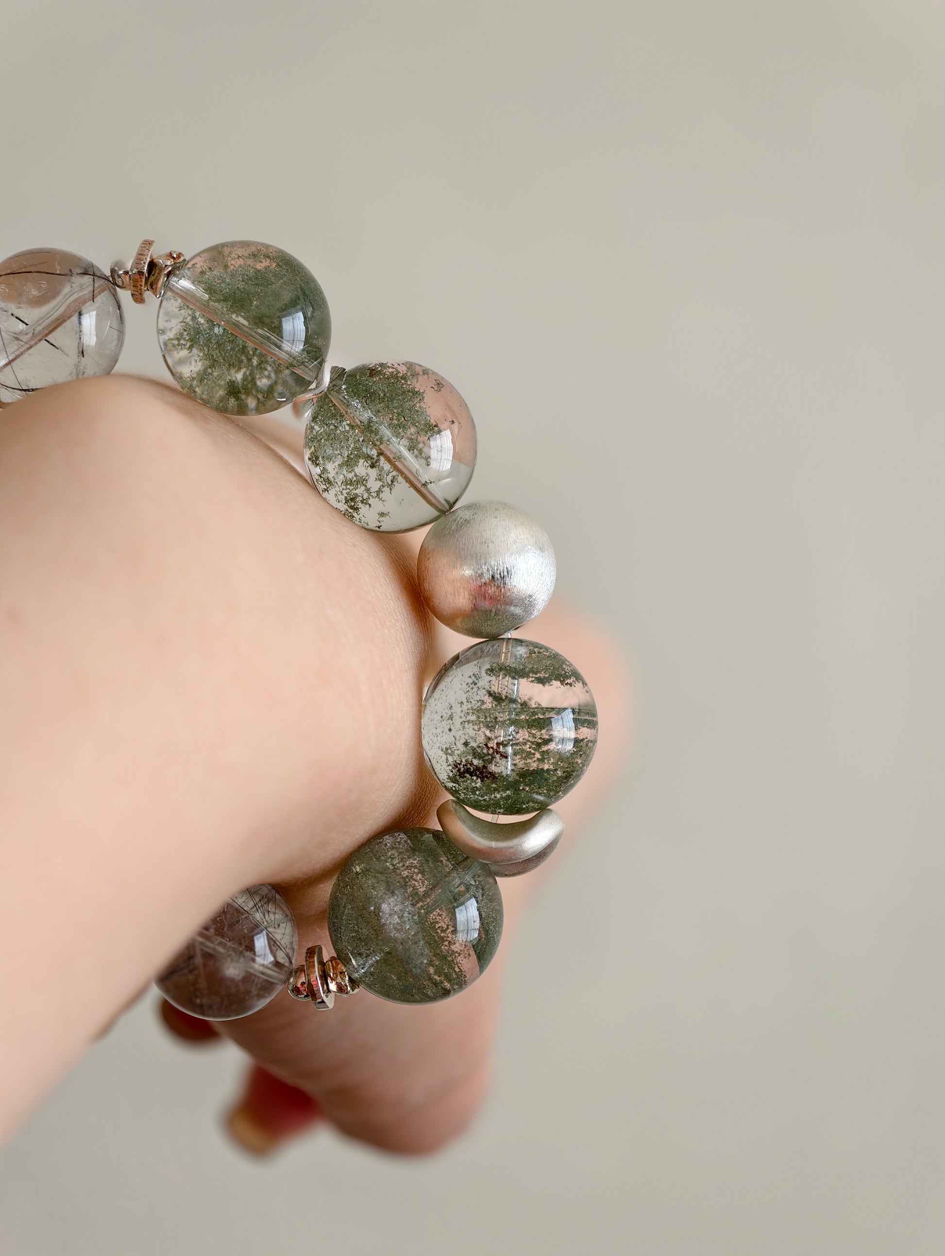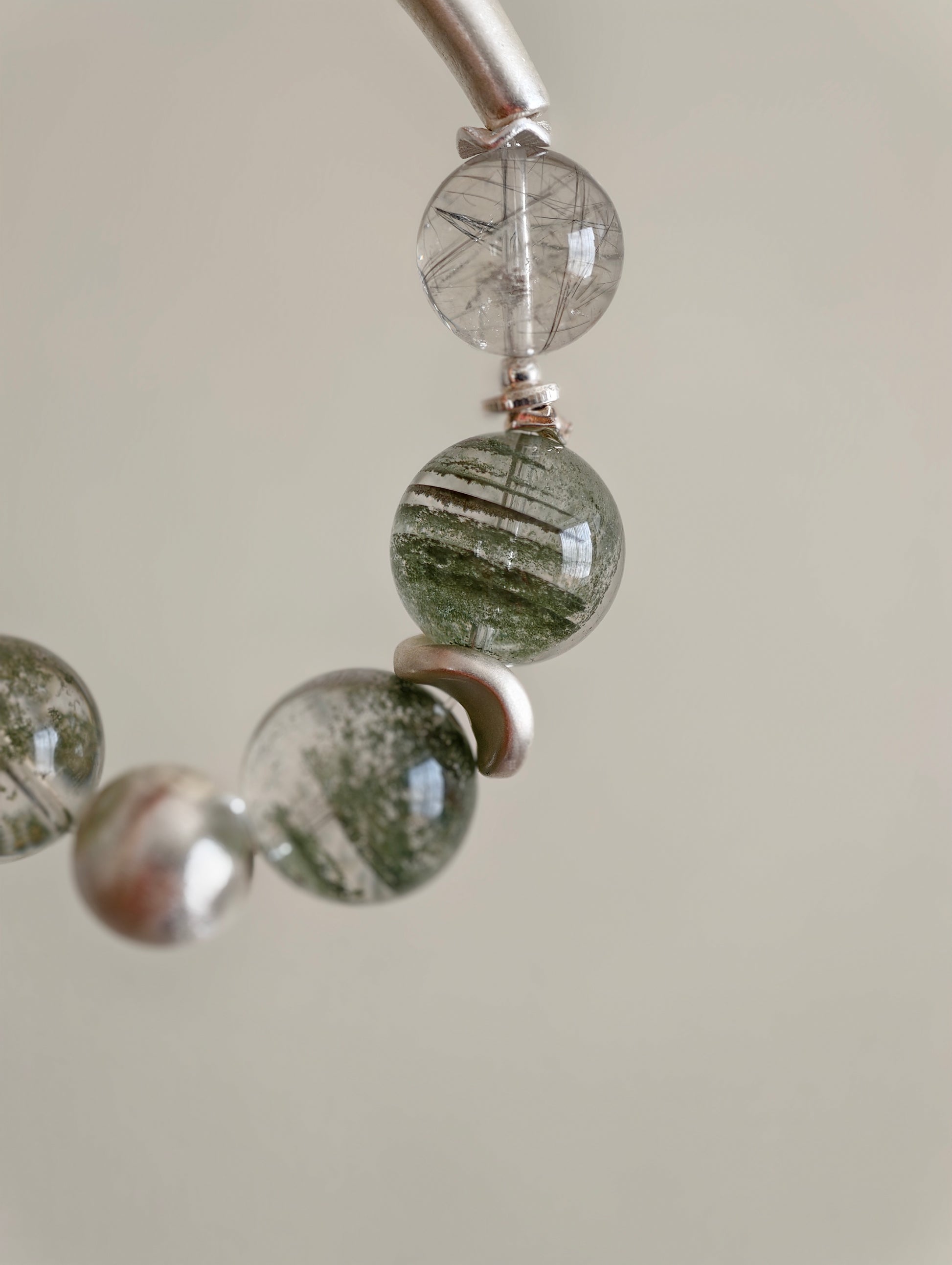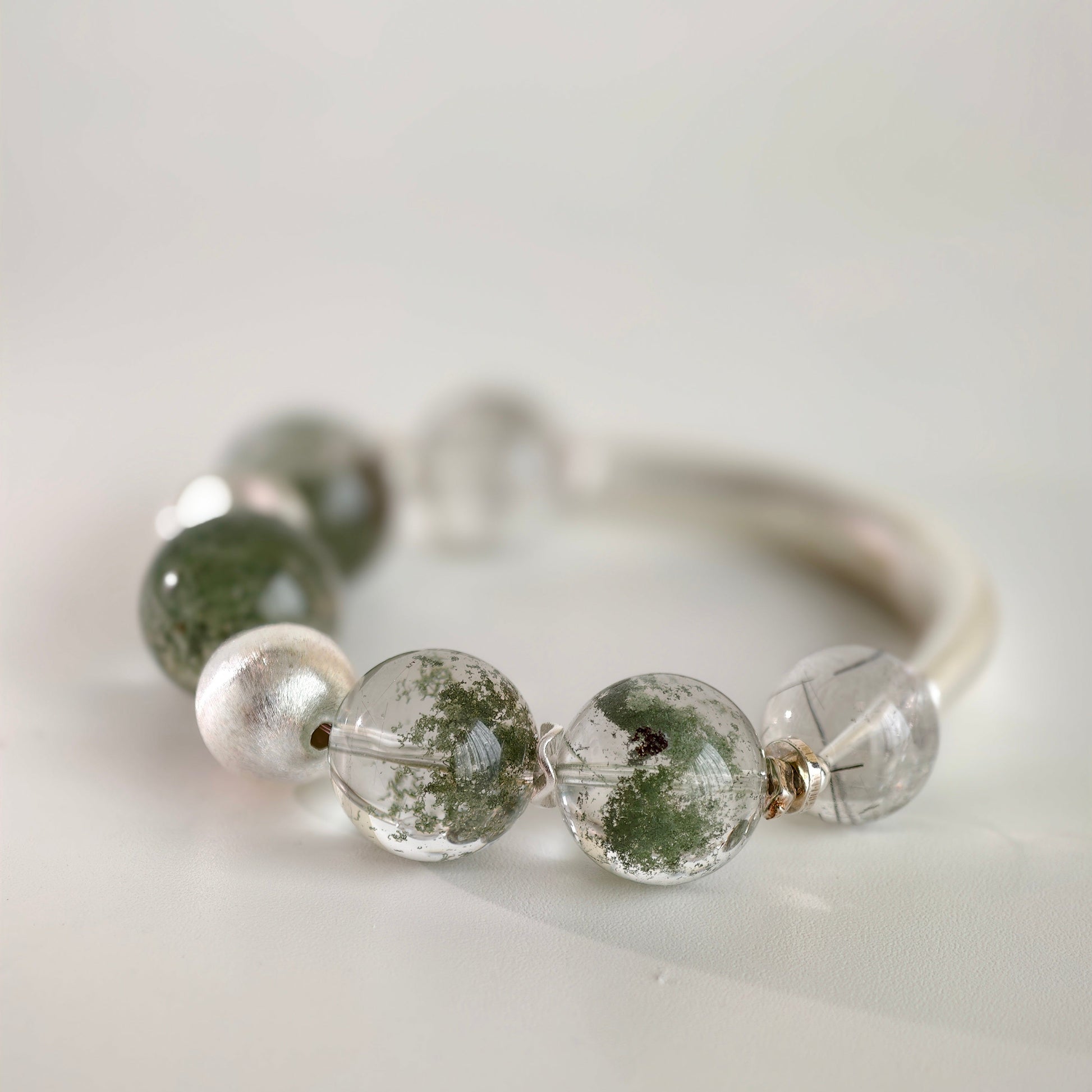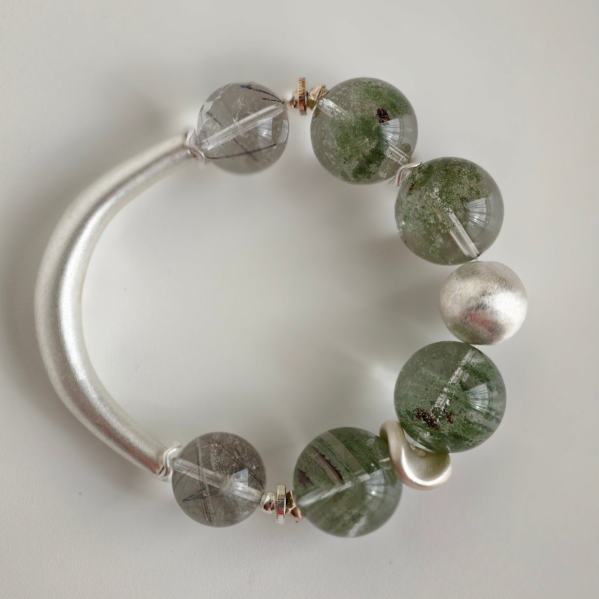 Each green phantom bead holds its own miniature world: moss-like inclusions, drifting mineral clouds, and gentle green tones that evoke ancient woodland energy. The black rutile threads add clarity and structure, like fine branches tracing through fog. The brushed silver half-bangle and accents complete the look with clean, architectural minimalism.