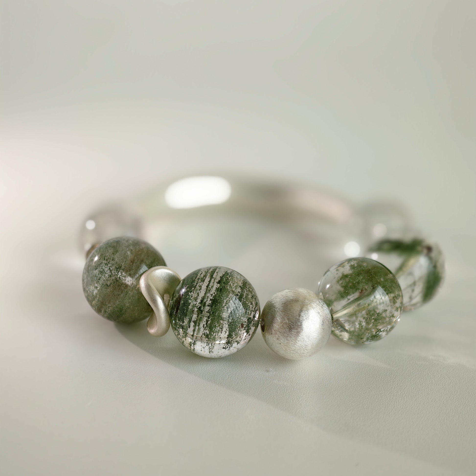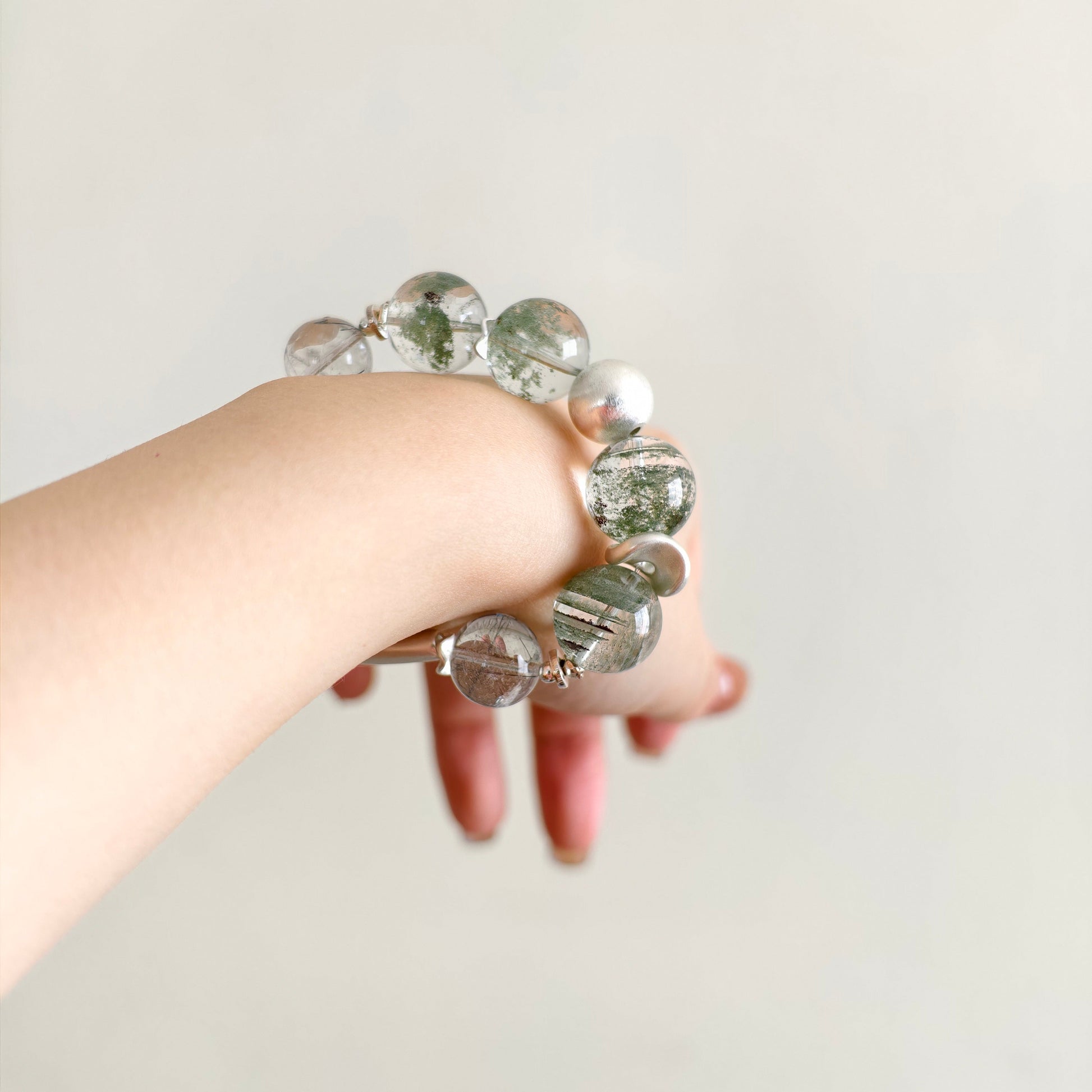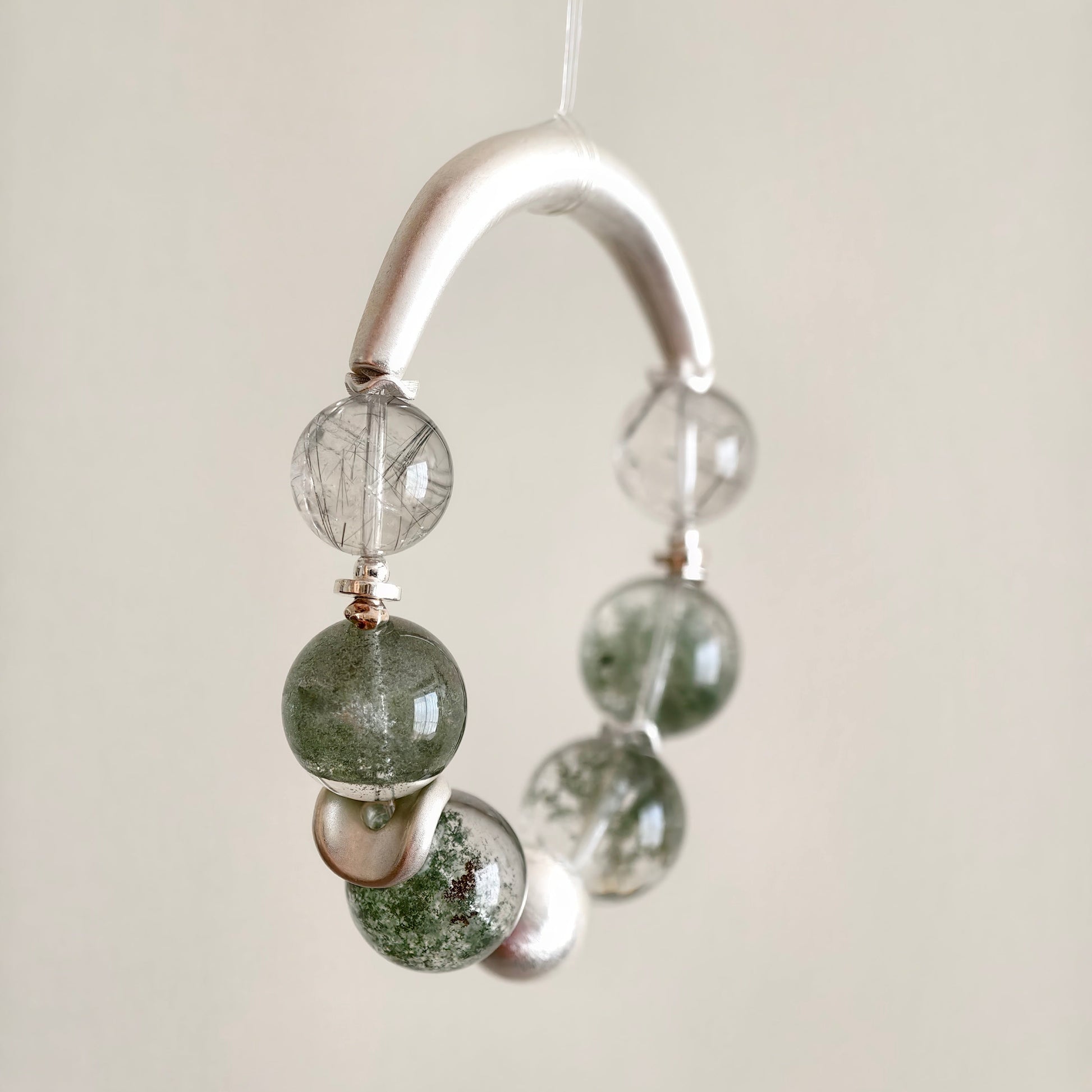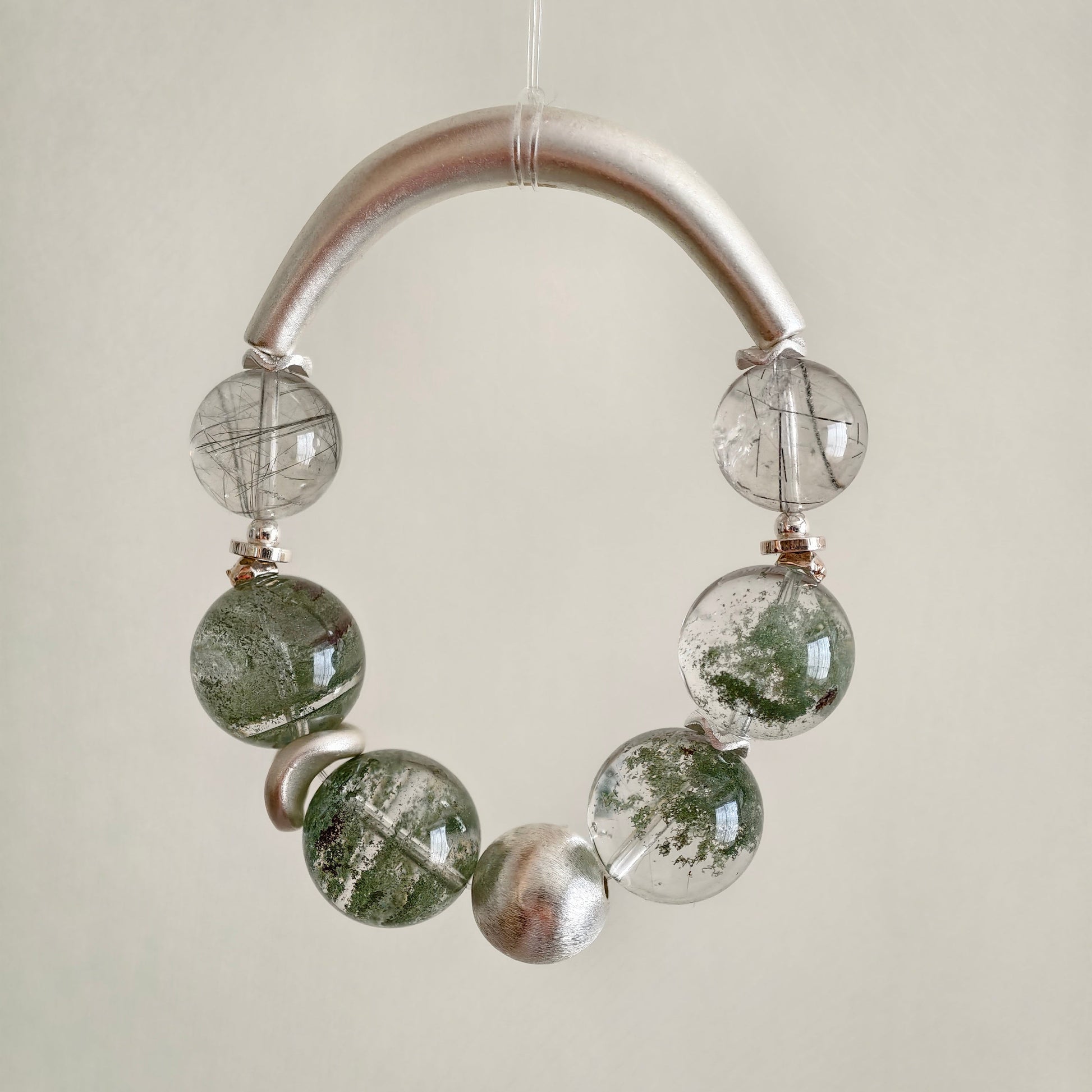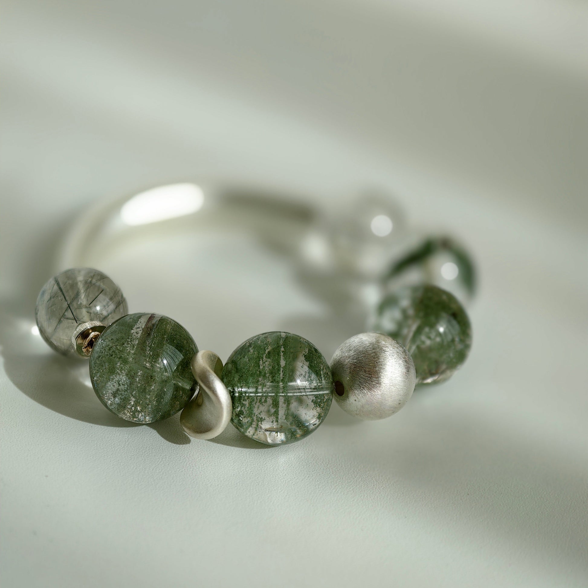 Each green phantom bead holds its own miniature world: moss-like inclusions, drifting mineral clouds, and gentle green tones that evoke ancient woodland energy. The black rutile threads add clarity and structure, like fine branches tracing through fog. The brushed silver half-bangle and accents complete the look with clean, architectural minimalism.