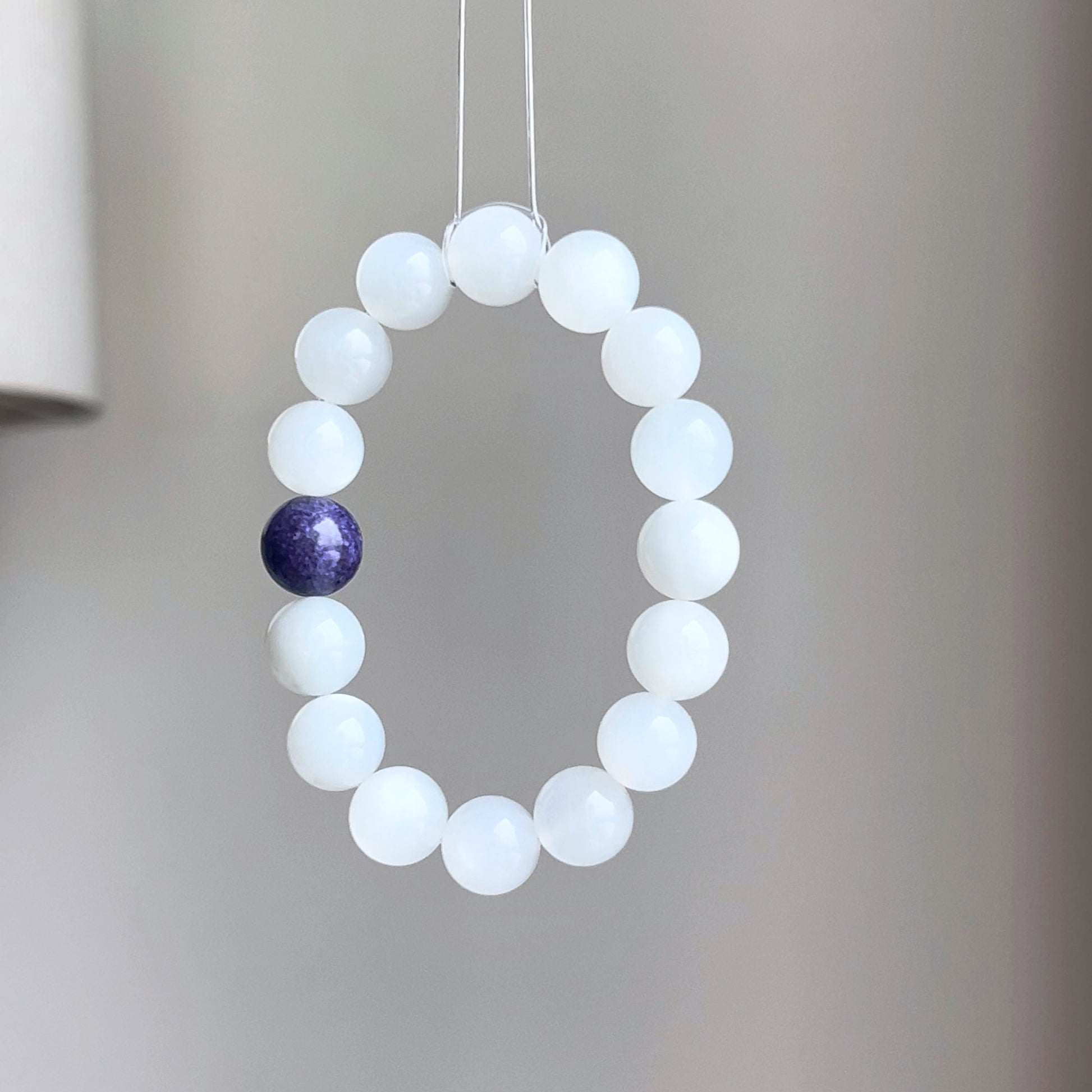 Together, these two stones weave a poetic contrast: the serene glow of the moon and the mysterious depth of a violet galaxy. Minimal in design yet rich in meaning, this bracelet feels like carrying a ribbon of moonlight and a spark of the cosmos on your wrist — elegant, soulful, and one-of-a-kind.