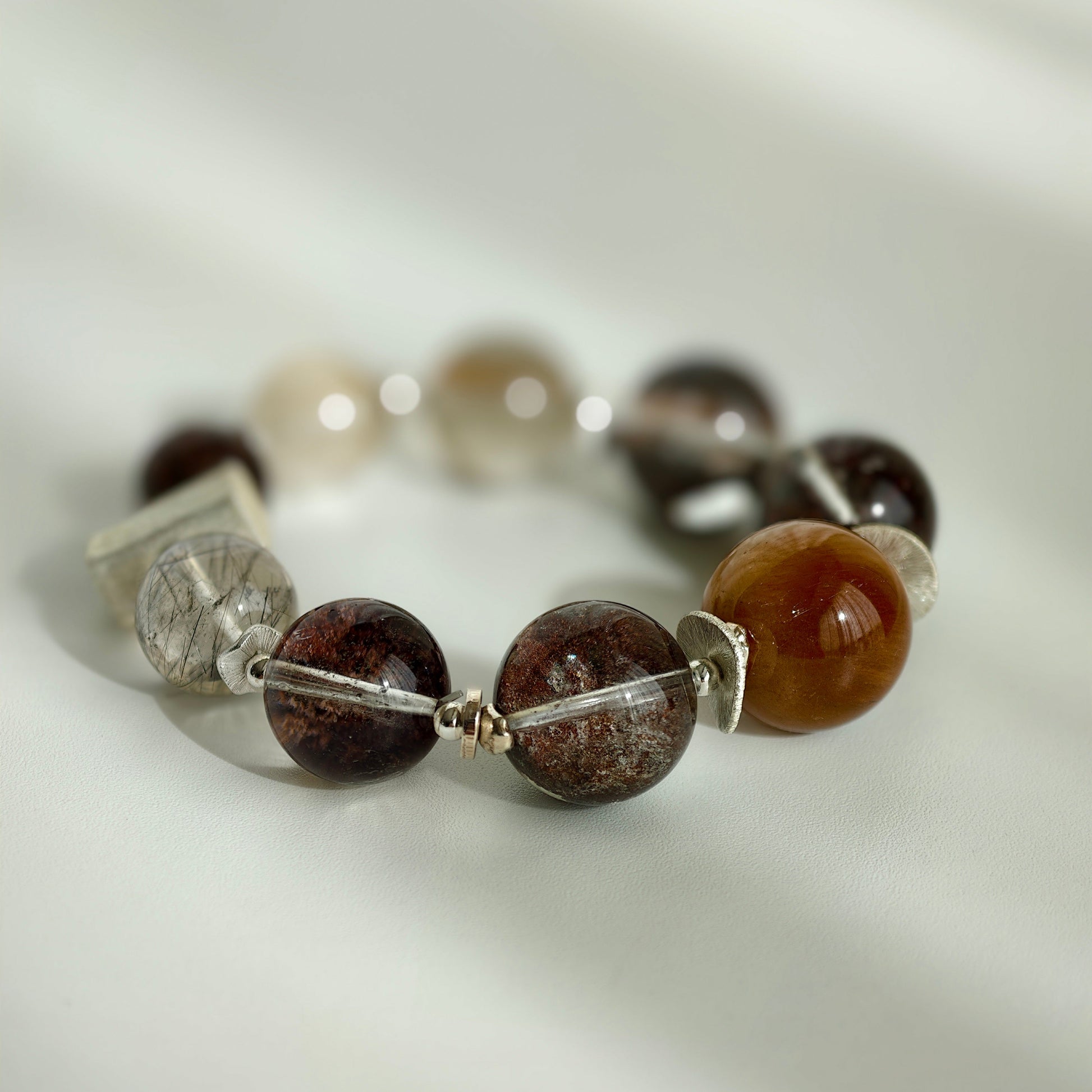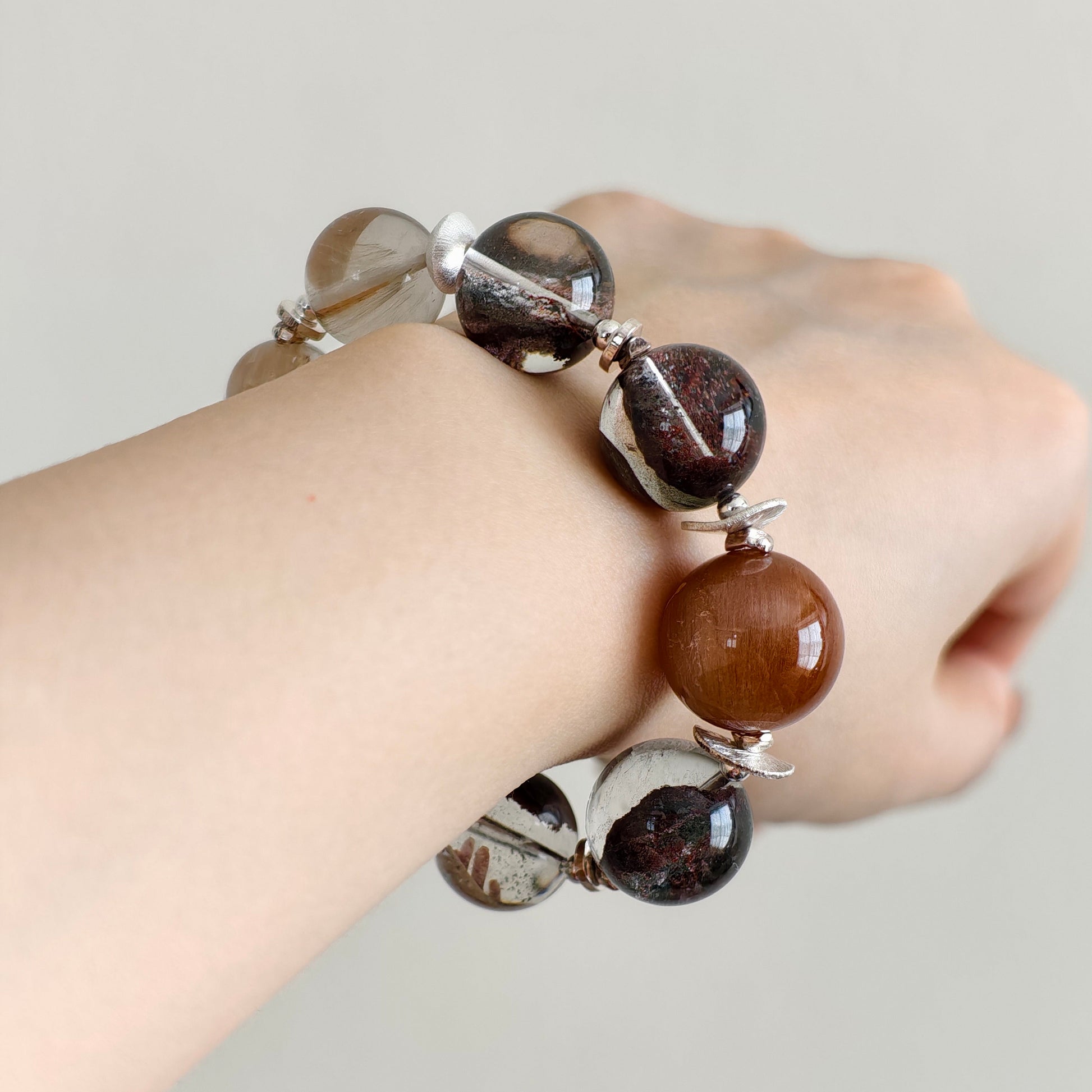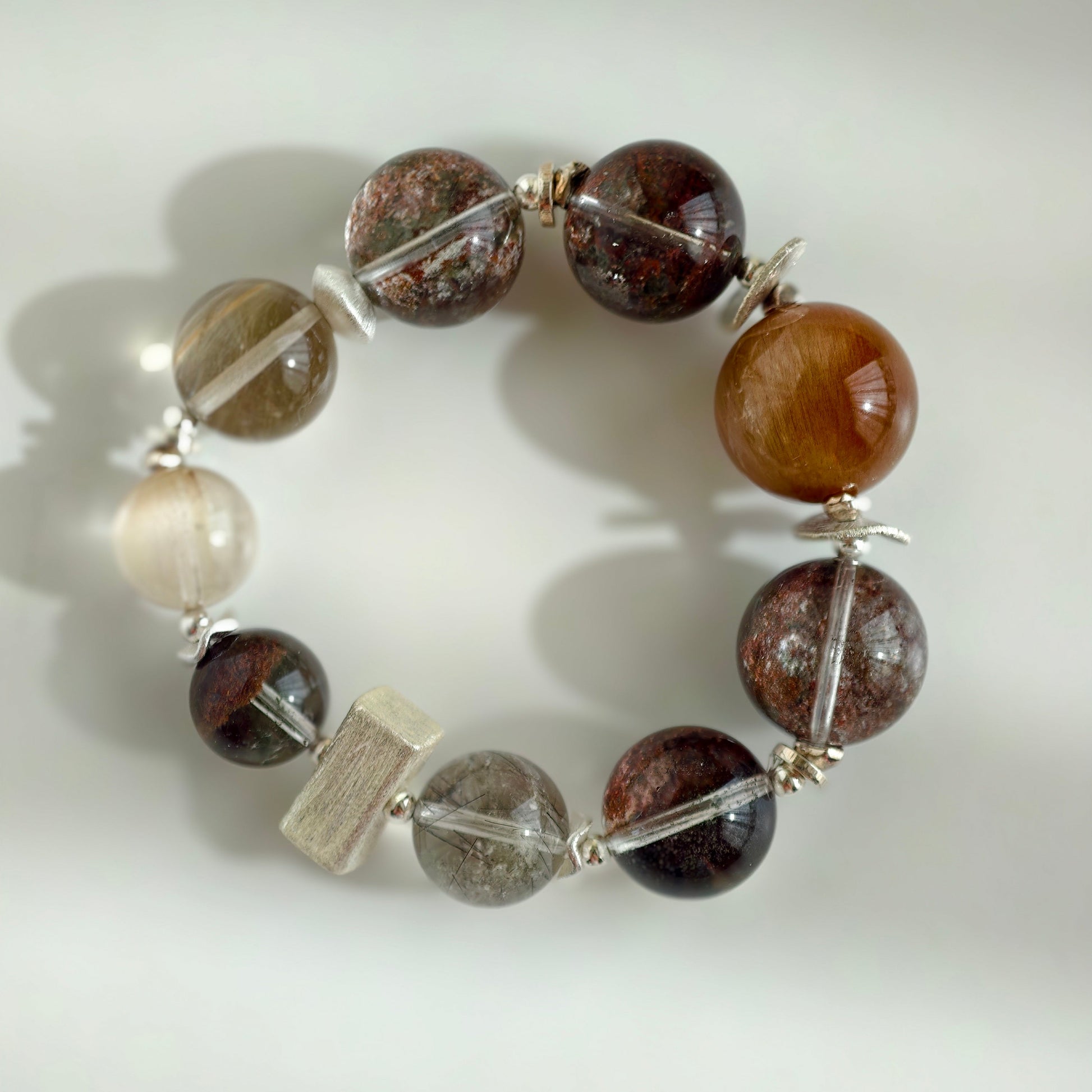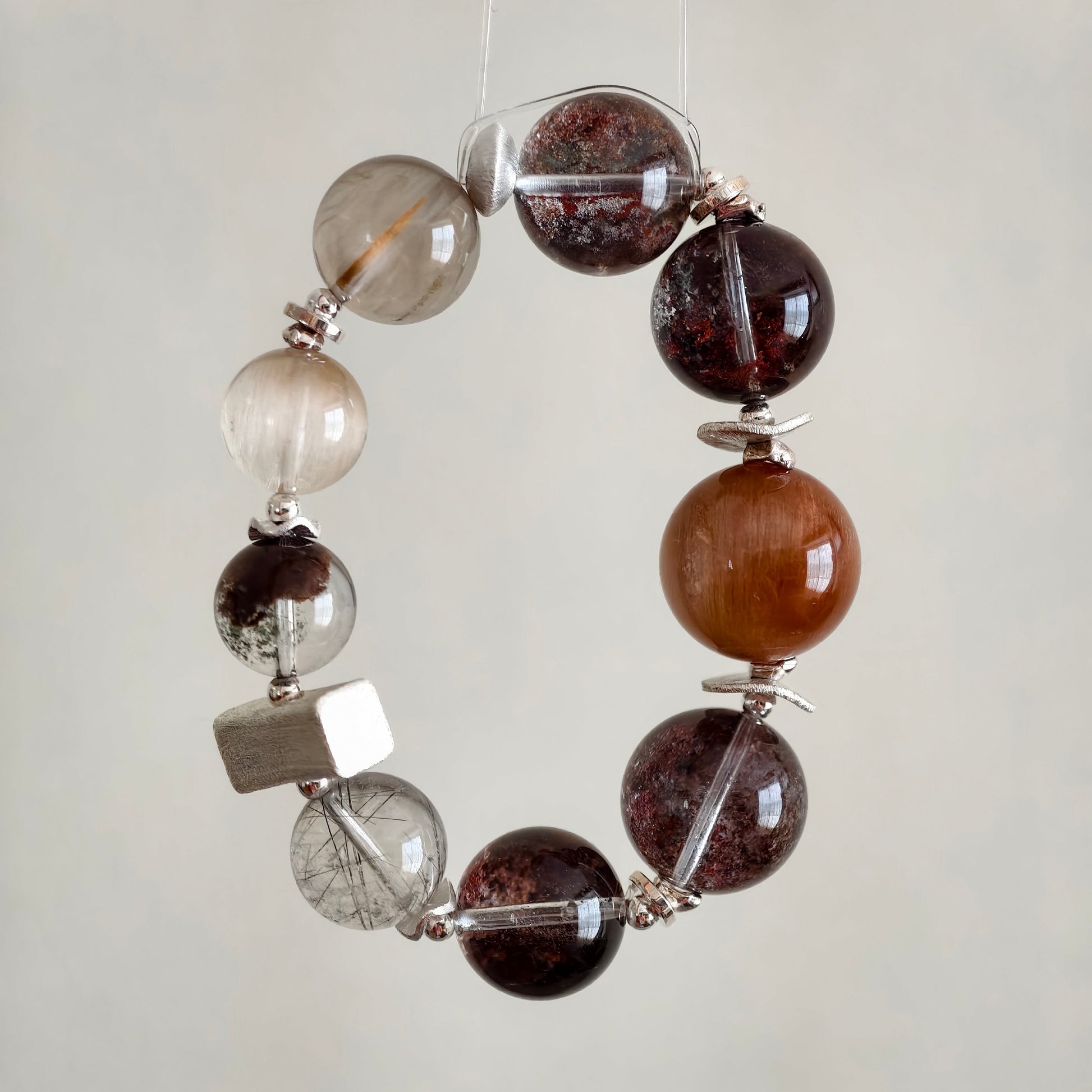 A bracelet that feels like stepping into a “crimson mist forest” at golden hour. The deep red rutile and red phantom beads carry the warmth of glowing embers, while the yellow rutile adds a soft golden beam cutting through the dusk. The garden quartz with hair-like inclusions brings a sense of quiet movement—like wind brushing through trees—making the whole piece breathe with natural rhythm.