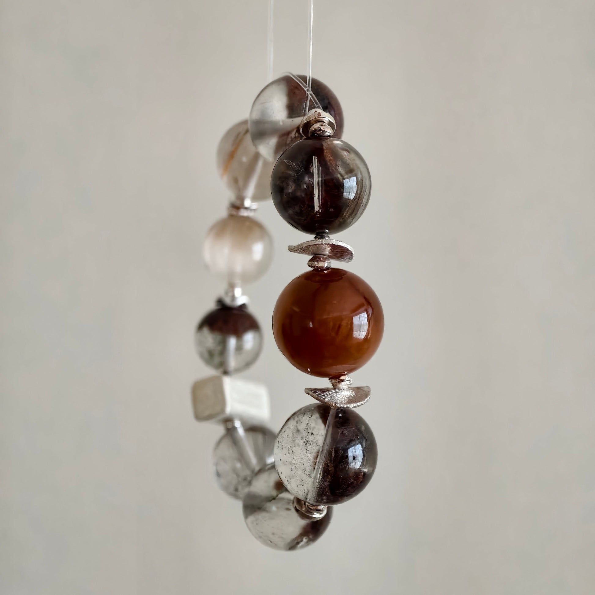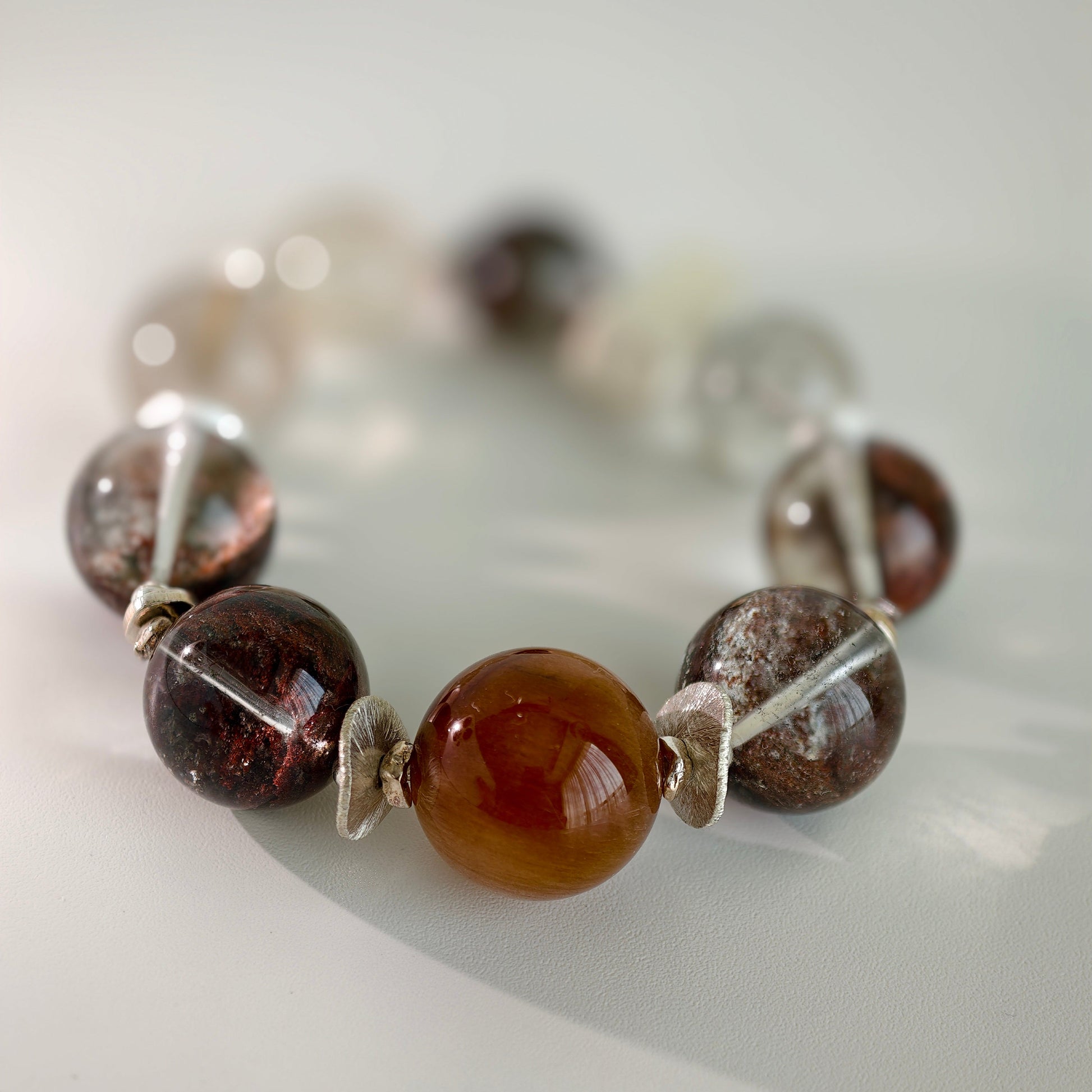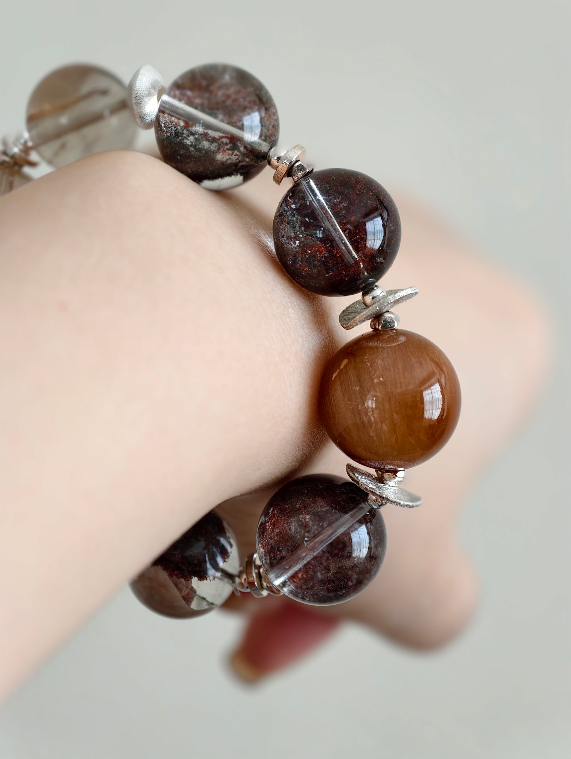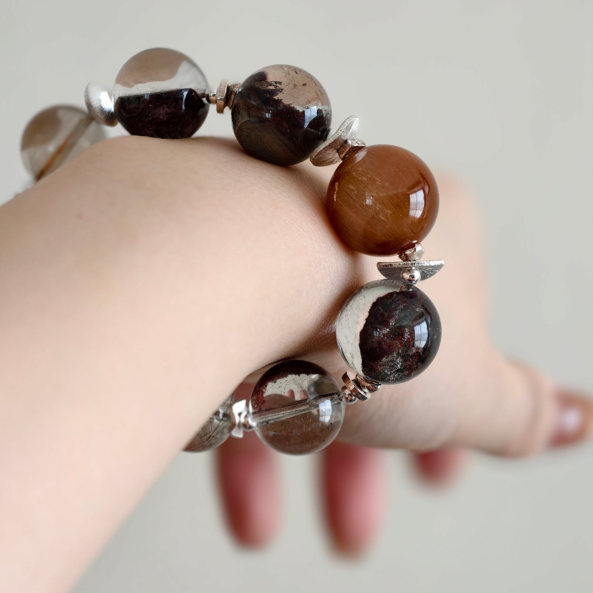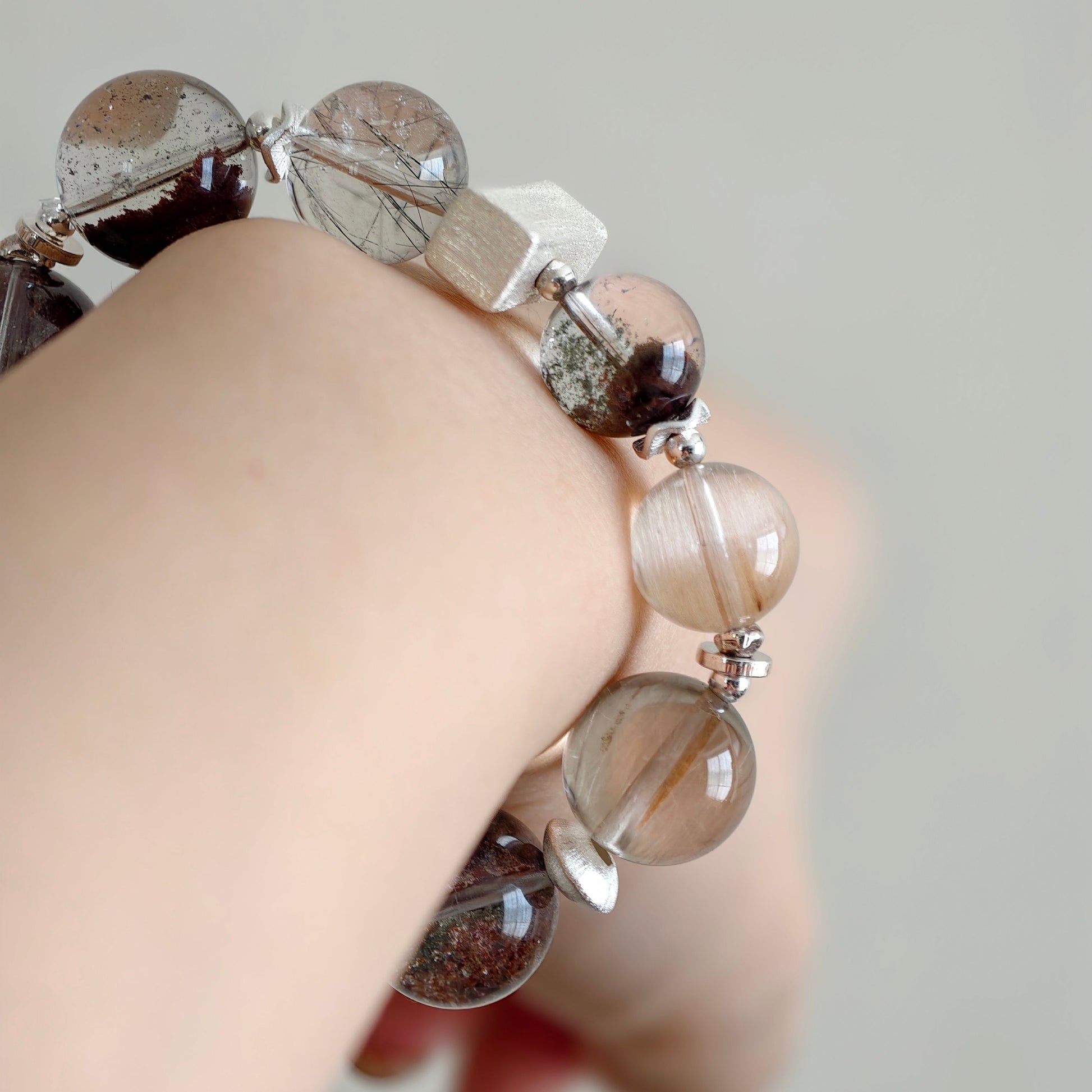 A bracelet that feels like stepping into a “crimson mist forest” at golden hour. The deep red rutile and red phantom beads carry the warmth of glowing embers, while the yellow rutile adds a soft golden beam cutting through the dusk. The garden quartz with hair-like inclusions brings a sense of quiet movement—like wind brushing through trees—making the whole piece breathe with natural rhythm.