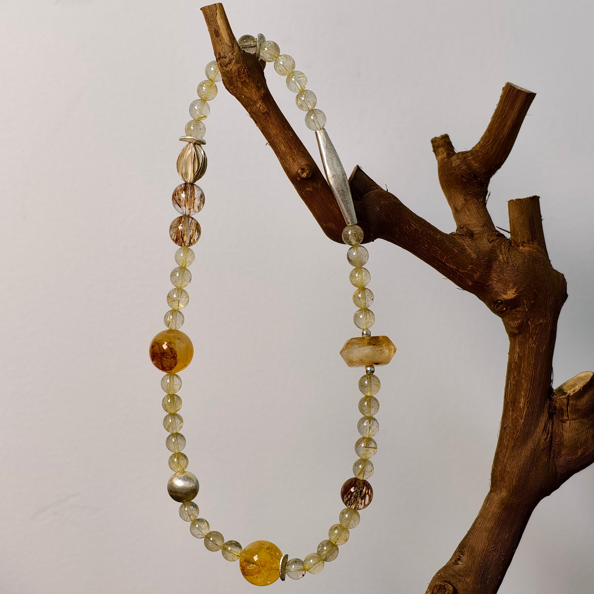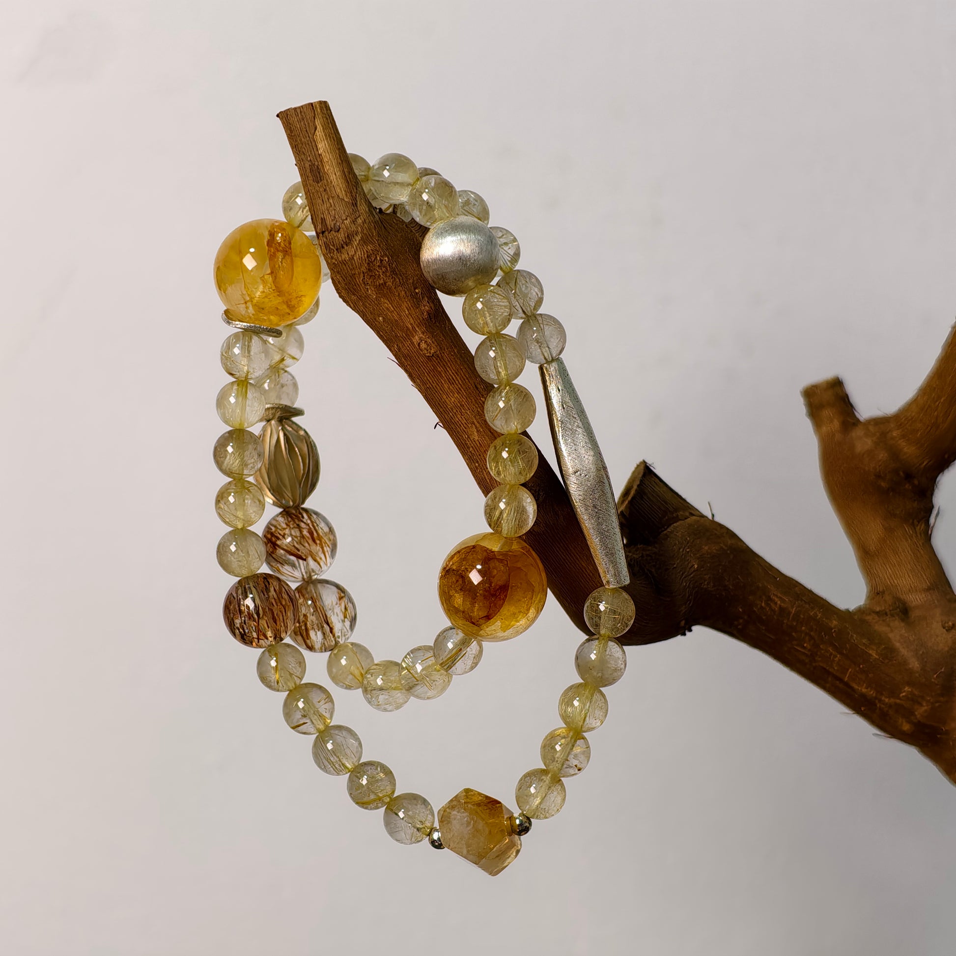 Layered twice for visual richness and sensory delight, this bracelet blends raw crystal energy with the elegance of handcrafted silver. The tactile mix of warm, smooth quartz and cool silver touches offers a grounding yet luminous presence — like wearing both sunrise and twilight around your wrist.